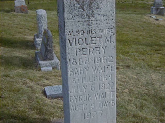 Byron Waite was buried in 1927 at McPhail's Cemetery, Brighton Twp., Northumberland Co., Ontario; Memorial: (See Exhibit) Also His Wife; Violet M; Perry; 1888 - 1962; Baby Waite; Stillborn; July 8, 1922; Byron Waite; Aged 9 Days; 1927 (McPhail's Cemetery, Brighton Twp., May 24 2004)