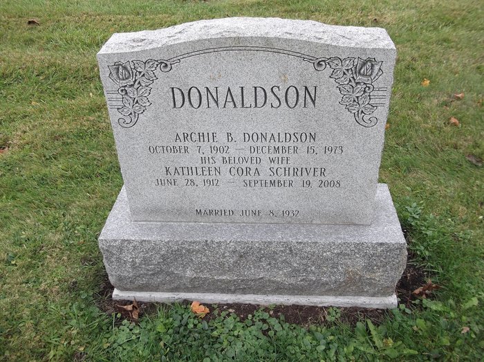 Archie Basil Donaldson was born on 7 October 1902 at Renfrew Co., Ontario; Birth Reg'n.#.. : Name: Bazel Archie Donaldson; Date: Oct 7 1902?; Parents: Daniel A. Donaldson? & Lucy Livingston?... pg. 2 n/a ... (Ontario Birth Registration, #... , ancestry.com) Record is badly written and typically, pg 2 not there ....) Date 1903 & location Ont. per 1921 Census. Date Oct 1902 & location Ont. per 1911 Census. Date Oct 7 1903 per GEDCOM of Troy Brown, July 9 2011. per Death Notice of daughter Marlene Yvonne (Donaldson) Herrington.1,2,4,5,3 He appeared on the census of 13 June 1911 at Sherwood & Jones Twp.'s, Renfrew South Co., Ontario; Age 8 at 1911 Census: see Daniel Donaldson.3 He appeared on the census of 1921 at Sherwood Twp., Renfrew South Co., Ontario; Age 18 at 1921 Census: see Daniel Donaldson.5 He married Kathleen Cora Viola Schriver, daughter of John Cylus Schriver and Mary Eliza Stimers, on 8 June 1932 at Ontario; Date Jun 8 1932 per Memorial. per Death Notice of daughter Marlene Yvonne (Donaldson) Herrington.1,6 Archie Basil Donaldson died on 15 December 1973 at Trenton, Hastings Co., Ontario, at age 71; Date Dec 15 1973 per Memorial. Date Dec 15 1973 & location Trenton per family tree of brianoliver160 on ancestry.com, Jun 9 2015. Date Dec 15 1973 per GEDCOM of Troy Brown, July 9 2011.2,6,7 He was buried on 18 December 1973 at Hilton Cemetery, Hilton, Northumberland Co., Ontario; Memorial: (See Exhibit) DONALDSON; Archie B. Donaldson; October 7, 1902 - December 15, 1973; His Beloved Wife; Kathleen Cora Schriver; June 28, 1912 - September 19, 2008; Married June 8, 1932 (Hilton Cemetery, Brighton Twp., image from www.findagrave added by K. 8/10./2012.)6