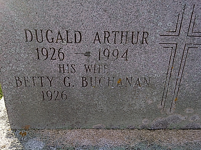 Dugald Arthur Stephens was born in 1926 at Ontario; Date 1926 per Memorial. per notes from Sheila Stephens-Smith, Nov 2011.1 He married Betty G. Buchanan, daughter of William Lindsay Buchanan and Eveline Rose Howe, circa 1955; per notes from Sheila Stephens-Smith, Nov 2011. Dugald Arthur Stephens died on 17 December 1994; Date Dec 17 1994 per notes from Sheila Stephens-Smith, Nov 2011. He was buried on 20 December 1994 at Mount Pleasant Cemetery, Campbellford, Northumberland Co., Ontario; Memorial: (See Exhibit) STEPHENS - BUCHANAN; Dugald Arthur; 1926 - 1994; Wife Wife; Betty G. Buchanan; 1926 - ; William Lindsay; 1891 - 1978; Eveline R. Howe; 1892 - 1991 (Mount Pleasant Cemetery, Campbellford, Nov 25 2011.)1