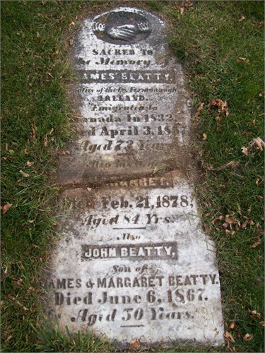 James Beatty was born in 1784 at Fermanagh Co., Ireland; "Date 1784 & "Native of Co. Fermanaugh, Ireland" per CEMSearch & Memorial. per Location Ireland per 1891 Census for son Johnston Beatty. per marriage register of son Johnston Beatty. Date 1784 & location Fermanagh, Ireland per IGI Record.1,2,3,4,5 He married Margaret Johnston in 1816 at Ireland; per marriage register of son Johnston Beatty. Date 1818 & location Fermanagh, Ireland per family tree of twodeys1 on ancestry.com, Nov 20 2011.1,6 James Beatty immigrated in 1832 to Canada; Immigration 1832 per Memorial. Son Alexander Beatty said to be born in the Atlantic Ocean.4 He died on 3 April 1857 at Hope Twp., Elizabethville, Northumberland Co., Ontario; Date Apr 3, 1857 per CEMSearch & Memorial. Date 1857 & location Elizabethville per IGI Record. Elizabethville is in Hope Twp. per Ontario Locator. Date Apr 3 1857 & location Port Hope per family tree of twodeys1 on ancestry.com, Nov 20 2011.3,6,4,5 He was buried on 5 April 1857 at Perrytown Anglican Cemetery, Hope Twp., Perrytown, Northumberland Co., Ontario; Memorial: (See Exhibit) Sacred to; the Memory of; James Beatty; Native of the Co. Fermanaugh; Ireland; Emigrated to; Canada in 1832; Died April 3, 1857; Aged 73 Years; Also His Wife; Margaret; Died Feb 21, 1878; Aged 84 Yrs; Also; John Beatty; Son of; James & Margaret Beatty; Died June 6, 1867; Aged 30 Years (Perrytown Cemetery, Hope Twp. - imaged copied from ancestry.com added by hopemerrifield Nov 14 2010)