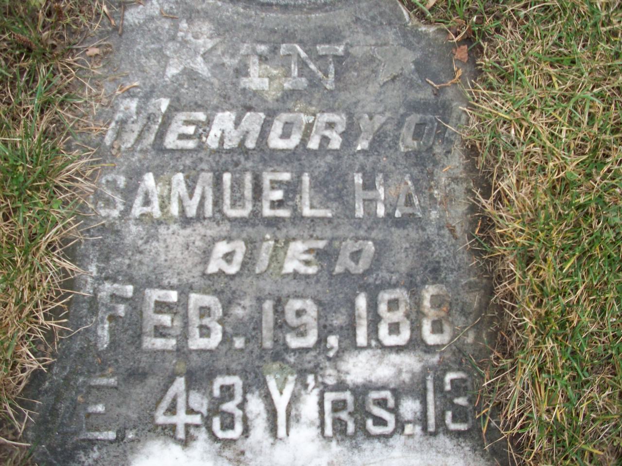 Samuel Haig was born on 6 February 1844 at Seymour Twp., Northumberland Co., Canada West; Date Feb 6 1844 per Memorial - age 43y 13d at death Feb 19 1887. Date 1843 & location Ont. per 1881 Census. Date 1842 & location Ont. per 1871 Census. Date 1843 & location UC per 1861 Census. Date 1841 & location Cda. per 1851 Census. Date 1843 & location Ont. per Marriage Register - 1st marriage. Date 1845 & location Seymour Twp. per marr. reg'n. - 2nd marriage. Date Feb 3 1844 & location Seymour rTwp. per family tree of J Douglas Williams on ancestry.ca, May 3 2021.1,2,3,4,5,6,7,8 He appeared on the census of 1852 at Seymour Twp., Northumberland Co., Ontario; Age 10 at 1851 Census: see Thomas Haig.2 He appeared on the census of April 1861 at Seymour Twp., Northumberland Co., Ontario; Age 18 at 1861 Census: see Thomas Haig.3 He married Mary Ann Martin, daughter of George Martin and Mary ?, on 17 February 1871 at Northumberland Co., Ontario; Marriage Register: Groom: Samuel Haig; Age: 28; Born: Ont; Parents: Thomas & Margaret Haig; Bride: Mary Ann Martin; Age: 30; Born: Newfoundland; Parents: George & Mary Martin; Date: Feb 17 1871; PlaceL: Northumberland & Durahm Co. (Ontario Marriage Register, ancestry.com) per 1871 Census.5,7 Samuel Haig appeared on the census of April 1871 at Seymour Twp., Northumberland Co., Ontario; Age 29 at 1871 Census: Haig, Samuel, 29, b. Ont., Scot., CS, farmer, married (Feb); Mary Ann, 30, b. Newfoundland, Eng., Bible Chr., married (Feb); John, 27, b. Ont., Scot., CS, farmer, single (1871 Census: Seymour Twp., Northumberland Co., dist. 55, sub-dist. G-2, pg. 10, line 7 - ancestry.com.)5 He married Margaret McNaughton, daughter of Neil McNaughton and Christianna ?, on 4 December 1876 at Campbellford, Northumberland Co., Ontario; Marriage Reg'n.#007372: Groom: Samuel Haig; Age: 34; Res. & Born: Seymour; Status: widower; Occ.: yeoman; Parents: Thomas & Margaret Haig; Bride: Margaret Johnston; Age: 26; Res. & Born: Seymour; Status: widow; Parents: Neil & Christianna McNaughton; Wit.: James Taylor & Martha Archer, Campbellford; Date: Dec 4 1876; Place: Campbellford; Rel.: Bible Christian; Performed by: Joseph Archer; Reg'r.: H. E. Skinner (Ontario Marriage Registration, #007372-1876, ancestry.com.)9 Samuel Haig lived on 17 February 1880 at Seymour Twp., Northumberland Co., Ontario; Residence Seymour Twp. per marr. reg'n.1 He married Mary Ann Stephens, daughter of Emmanuel Stephens and Mary W. Worden, on 17 February 1880 at Seymour Twp., Northumberland Co., Ontario; Marriage Reg'n.#007583: Groom: Samuel Haig; Age: 35; Res. & Born: Seymour Twp; Status: bachelor; Occ.: farmer; Parents: Thomas & Margaret Haig; Bride: Mary A. Stephens; Age: 21; Res. & Born: Seymour Twp; Status: spinster; Parents: Emmanuel & Mary Stephens; Wit.: Peter Haig & Hanah B. Stehens, Seymour Twp; Date: Feb 17 1880; Place: Seymour Twp; Rel.: Bible Christian; Performed by: John G. ?Gelland; Reg'r.: John Rutehrford, Seymour Twp. (Ontario Marriage Registration, #007583-1880, ancestry.com.)10 Samuel Haig appeared on the census of April 1881 at Seymour Twp., Northumberland Co., Ontario; Age 38 at 1881 Census: Haig, Samuel, 38, b. Ont., Scot., C. Pres., farmer, married; Mary Ann, 22, b. Ont., Eng., C. Pres., married; Arthur, 8, b. Ont., Scot., C. Pres; Lucy, 3, b. Ont., Eng., C. Pres. (1881 Census: Seymour Twp., Northumberland Co., dist. 123, sub-dist. g, pg. 19, line 22 - ancestry.com.)11 He died on 19 February 1887 at Seymour Twp., Northumberland Co., Ontario, at age 43; Date Feb 19 1887 per Memorial. Date Feb 19 1905 & location Campbellford per family tree of J Douglas Williams on ancestry.ca, May 3 2021.6,8 He was buried on 21 February 1887 at Mount Pleasant Cemetery, Campbellford, Northumberland Co., Ontario; Memorial: (See Exhibit) In; Memory of; Samuel Haig; Died; Feb. 19, 1887; AE 43 Y'rs 13 D (Mount Pleasant Cemetery, campbellford, Nov 26 2011.)6