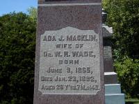 Ada Jane Macklin was born on 9 June 1865 at Hamilton Twp., Northumberland Co., Ontario; Date Jun 9 1865 per Memorial. Date 1865 & location Hamilton Twp. per marr. reg'n. Date Jun 9 1865 per family tree of elizabethlinngiles on ancestry.com, Nov 24 2011.1,2,3 She lived on 12 June 1890 at Hamilton Twp., Northumberland Co., Ontario; Residence Hamilton Twp. per marr. reg'n.1 As of 12 June 1890,her married name was Wade.1 She married William Ryerson Wade, son of William Wade and Amerilla Smith, on 12 June 1890 at Hamilton Twp., Northumberland Co., Ontario; Marriage Reg'n.#008604: Groom: William Ryerson Wade; Age: 26; Res.: Dunchurch, Hagerman Twp., Dist. of Parry Sound; Born: Brighton Twp; Status: bachelor; Occ.: Physician; Parents: William & Amarilla Wadw; Bride: Ada Jane Macklin; Age 25; Res. & Born: Hamilton Twp; Status: spinster; Parents: Edmund & Jane Macklin; Wit.: R. J. Wade, Brighton & Ella J. Macklin, ?Pennwell?; Date: Jun 12 1890; Place: Hamilton Twp; Rel.: Meth; Performed by: Rev. John A. McCaimus?; Reg'r.: A. R. Eagleson (Ontario Marriage Registration, #008604-1890, ancestry.com.)4 Ada Jane Macklin died on 23 January 1892 at Dunchurch, Parry Sound Dist., Ontario, at age 26; Date Jan 23 1892 per Memorial. per family tree of elizabethlinngiles on ancestry.com, Nov 24 2011.2,3 She was buried on 26 January 1892 at Waite Cemetery, Cramahe Twp., Northumberland Co., Ontario; Memorial: (See Exhibit) Ada J. Macklin; Wife of; Dr. W. R. Wade; Born; Jun 9, 1865; Died Jan. 23, 1892; Aged 26 Y'rs. 7 M. & 14 D. (Waite Cemetery, Cramahe Twp., Jul 3 2004.)3