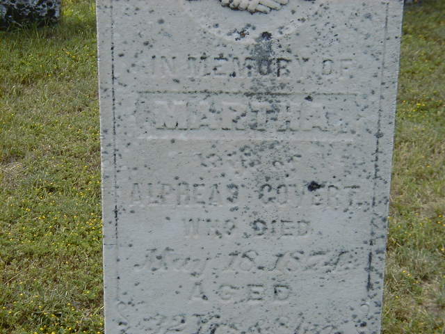 Martha Deborah Platt was born in March 1842 at Ontario; Date Mar 1842 per Memorial - age 32y 2?m at death May 18 1874. Date 1841 & location Ont. per 1871 Census. per family tree of JessieEden on ancestry.com, Jan 3 2012.1,4,5 As of before 1865,her married name was Covert.1 She married Alpheas Covert, son of Tunis Covert and Sarah Hunter, before 1865 at Northumberland Co., Canada West; Martha Platt is mother of Watler M. Covert per his marriage registration. This means that Allan (or Albert) Covert was the same guy as Alpheus Covert. Much confusion re this.2 Martha Deborah Platt appeared on the census of April 1871 at Percy Twp., Northumberland Co., Ontario; Age 30 at 1871 Census: see Allan Covert.4 She died on 18 May 1874 at Percy Twp., Northumberland Co., Ontario, at age 32; Date May 18 1874 per Memorial.5 She was buried on 20 May 1874 at Warkworth Cemetery, Warkworth, Northumberland Co., Ontario; Memorial: (See Exhibit) In Memory of; Martha; Wife of; Alpheas Covert; Who Died; May 18, 1874; Aged; 32 Yrs & 2? Mo. (Warkworth Cemetery, Warkworth.)5