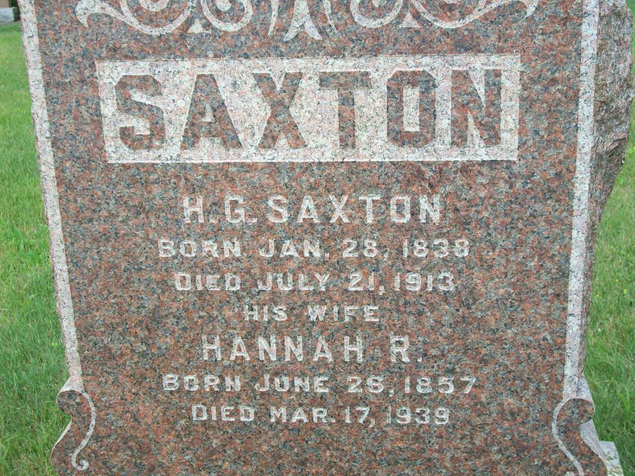 "3477. Horatio G., m. Hannah Vanwicklin; res. Brighton, Ont." per Spafford Genealogy pg 295 of 521, ancestry.ca.2,10,8 Horatio Gates Saxton appeared on the census of April 1881 at Brighton, Northumberland East Co., Ontario; Age 42 at 1881 Census: Saxton, Horation, 42, b. Ont., Eng., EM, farmer, married; Hannah R., 23, b. Ont., Ger., EM, married (1881 Census: Brighton Village, Northumberland East Co., dist. 123, sub-dist. d, pg. 12, line 3 - ancestry.ca.)6 He lived on 28 September 1885 at Conc 2 Lot 5, Brighton Twp., Northumberland Co., Ontario; Land Registry Records (Grant 4089) show that Sarah A. Alexander (spinster), Hannah J. Hare & Wellington Hare sold 20 acres in the west half of the south 40 acres of lot 5, conc. 2, Brighton Twp., Northumberland Co. to Horatio G. Saxton for $512.50. ITS Date: Apr 28 1885. Reg'n. Date: Oct 1 1885. (Ontario Land Registry Records, Northumberland Co., Brighton Twp., Conc 02, pg. 066 of 317, page copied from OnLand.ca by Dan Buchanan, Apr 11, 2020.)9 He lived in 1899 at Conc 2 Lot 5, Brighton Twp., Northumberland Co., Ontario; "Saxton, H.G. .. Brighton .. f. 2 5" Canada City & Area Directories, 1899, Northumberland Co., Brighton Twp., pg. 156 of 253, ancestry.ca.8 He lived on 17 October 1907 at Conc 2 Lot 5, Brighton Twp., Northumberland Co., Ontario; Land Registry Records (Grant 8463) show that Horatio G. Saxton & wife sold 1 acre in lot 5, conc. 2, Brighton Twp., Northumberland Co. to William C. Adams for $50. ITS Date: Oct 17 1907. Reg'n. Date: Sep 1 1909. (Ontario Land Registry Records, Northumberland Co., Brighton Twp., Conc 02, pg. 067 of 317, page copied from OnLand.ca by Dan Buchanan, Apr 11, 2020.)9 He lived on 31 August 1909 at Conc 2 Lot 5, Brighton Twp., Northumberland Co., Ontario; Land Registry Records (Grant 8464) show that Horatio G. Saxton & wife sold part of lot 5, conc. 2, Brighton Twp., Northumberland Co. to Gertrude P. Herkimer $3,000. ITS Date: Aug 31 1909. Reg'n. Date: Sep 1 1909. (Ontario Land Registry Records, Northumberland Co., Brighton Twp., Conc 02, pg. 067 of 317, page copied from OnLand.ca by Dan Buchanan, Apr 11, 2020.)9 He lived on 1 March 1910 at Village Lot 15, Main St. North, Brighton, Northumberland Co., Ontario; Land Records (Quit Claim 4395) show that Nellie N. Lawson, Andrew J. Lawson & Almeda Lawson issues a Quit Claim on part of Village Lot 15, Main Street North Side, Village of Brighton, Northumberland Co. to Horatio G. Saxton for $2,000. ITS Date: Mar 1 1910. Reg. Date: Mar 4 1910. (Land Registry Records, Northumberland Co., Brighton Village, Book 004, pg. 331 of 399, page copied from OnLand.ca by Dan Buchanan, Apr 13 2023.)9 He appeared on the census of 1911 at Brghton, East Northumberland Co., Ontario; Age 72 at 1911 Census: Saxton, Horatio G., 72, b. Ont. Feb 1839, Eng., Meth., retired farmer, married; Hannah R., 53, b. Ont. Jun 1857, Ger., Meth., married; Adams, William, 28, b. Ont. Aug 1882, Eng., Meth., butcher, adopted son, married; Beatrice, 28, b. Ont. Aug 1882, Eng., Meth., dau.-in-law, married; Mable, 6, b. Ont. Aug 1904, b. Ont., Eng., grand dau; Lola, 4, b. Ont. Nov 1906, grand dau; Ellwood, 1, b. Ont. Feb 1910, grand son (1911 Census: Brighton Village, East Northumberland Co., dist. 101, sub-dist. 12-1, pg. 8, line 33 - Main St. - ancestry.ca.)2 He lived on 19 November 1912 at Village Lot 15, Main St. North, Brighton, Northumberland Co., Ontario; Land Records (Grant 4766) show that Horatio G. Saxton & wife sold "said "lot" part of Village Lot 15, Main Street North Side, Village of Brighton, Northumberland Co. to Fred S. Cornwall for $2,000. ITS Date: Nov 19 1912. Reg. Date: Nov 20 1912. (Land Registry Records, Northumberland Co., Brighton Village, Book 004, pg. 331 of 399, page copied from OnLand.ca by Dan Buchanan, Apr 13 2023.)9 He died on 21 July 1913 at Brighton, Northumberland Co., Ontario, at age 75; Death Reg'n.#023732: Name: Horation Gates Saxton; Date: Jul 21 1913; Age: 75y 5m 22d; Res.: Brighton, Ont; Born: Jan 28 1838; Occ.: farmer; Parents: David Saxton, b. "on ocean ice" & Miss Susannah Spafford, b. Vermont; Inf.: Mrs. Agusta Meredith, Brighton; Cause: heart failure, cystiies, 2m; Phys.: C.M. Sanford; Reg'd.: Jul 23 1913 (Ontario Death Registration, #023732-1913, ancestry.ca) Date Jul 21 1913 per Memorial.3,11 He was buried on 23 July 1913 at Woods Cemetery, Cramae Twp., Northumberland Co., Ontario; Memorial: (See Exhibit) SAXTON; H. G. Saxton; Born: Jan. 28, 1838; Died July 21, 1913; His Wife; Hannah R; Born: Jun 28 1857; Died Mar. 17, 1939 (Woods Cemetery, Cramahe Twp., July 6 2009.)3