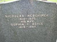 Note: An IGI Records shows "Birth: 1819 Skowhegan, Maine" - same as Nichalas Herchimer????1,2,3,4,5,6 She married Nicholas Herchimer, son of Johan Nicholas Herkimer and Charlotte Purdy, on 15 October 1833 at Northumberland Co., Ontario; per marriage register of daughter Charlotte (Merkimer) Pollock. Date Oct 15 1833 & location Newcastle Dist. per family tree of shantalingram on ancestry.com, July 31 2012.1,5 As of 15 October 1833,her married name was Herchimer.1 Sophia Caroline Boyce appeared on the census of 1852 at Percy Twp., Northumberland Co., Ontario; Age 34 at 1851 Census: see Nicholas Herchimer.4 She appeared on the census of April 1861 at Percy Twp., Northumberland Co., Ontario; Age 43 at 1861 Census: see Nicholas Herchimer.3 She died on 30 November 1865 at Percy Twp., Northumberland Co., Ontario; Date 1865 per Memorial. Date Nov 30 1867 & location Percy Twp. per family tree of shantalingram on ancestry.com, July 31 2012.2,5 She was buried on 2 December 1865 at Warkworth Cemetery, Warkworth, Northumberland Co., Ontario; Memorial: (See Exhibit) Nicholas Herchimer; 1810 - 1875; His Wife; Sophia C. Boyce; 1819 - 1865 (Warkworth Cemetery, Warkworth, Jul 7 2009.)2