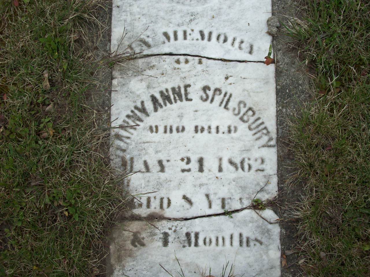 Fanny Anne Spilsbury was born in April 1854 at Cramahe Twp., Northumberland Co., Ontario; Date Apr 1854 per Memorial - age 8y 1m at death May 21 1862.1 She died on 21 May 1862 at Colborne, Northumberland Co., Ontario, at age 8.1 She was buried on 23 May 1862 at Trinity Anglican Church Cemetery, Colborne, Northumberland Co., Ontario; Memorial: (See Exhibit) In Memory of; Fanny Anne Spilsbury; Who Died; May 21, 1862; Aged 8 Years; & 1 Months (Trinity Anglican Church Cemetery, Colborne, May 8 2012.)1