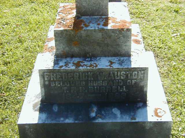 CemSearch: Name: Frederick W. Auston; Born: 1847; Died: 1923; Age: 76y; ID: MTHOPE102; Other name: Burrell, T. Frances R. (185201938); Cemetery: Mount Hope Cemetery, Conc A, Lot 35, Brighton Twp., Northumberland Co., Village of Brighton, Sec 1 Row 5 (https://www.cemsearch.ca/burial/?pid=MTHOPE102%5E0) per Death Reg'n.6,9,10