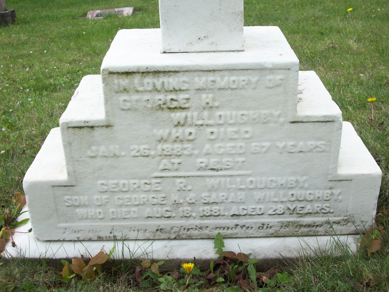 George R. Willoughby was born in 1853 at Simcoe Co., Ontario; Date 1853 per Memorial. Date 1853 & location Ont. per 1871 Census. Date 1853 & location Cda. per 1861 Census. Location Simcoe Co. per family tree of davidlookabaugh1 on ancestry.com, May 19 2012.1,4,2,3 He appeared on the census of April 1861 at Essa Twp., Simcoe Co., Ontario; Age 8 at 1861 Census: see George Willoughby.2 He appeared on the census of April 1871 at Haldimand Twp., Northumberland Co., Ontario; Age 18 at 1871 Census: see George Willoughby.3 He died on 18 August 1881 at Colborne, Northumberland Co., Ontario; Date Aug 18 1881 per Memorial.1 He was buried on 20 August 1881 at Trinity Anglican Church Cemetery, Colborne, Northumberland Co., Ontario; Memorial: (See Exhibit) In Loving Memory of; George H; Willoughby; Who Died; Jan. 26, 1883, Aged 67 Years; At Rest; George R. Willoughby; son of George H. & Sarah Willoughby; Who Died Aug. 18, 1881, Aged 28 Years (Trinity Anglican Church Cemetery, Colborne, May 8 2012.)1