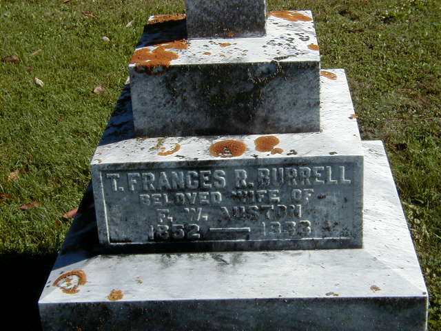 CemSearch: Name: T. Frances Burrell; Born: 1852; Died: 1938; Age: 86y; ID: MTHOPE102; Other name: Auston, Frederick W. (1847-1923); Cemetery: Mount Hope Cemetery, Conc A, Lot 35, Brighton Twp., Northumberland Co., Village of Brighton, Sec 1 Row 5 (https://www.cemsearch.ca/burial/?pid=MTHOPE102%5E1)