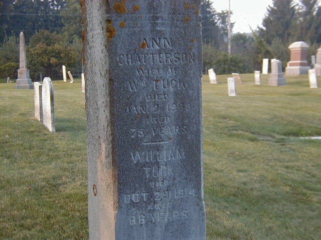 Ann Chatterson was born on 2 January 1833 at Cramahe Twp., Colborne, Northumberland Co., Upper Canada; Date 1833 per Memorial - age 75 at Death Jan 9 1908. Date 1834 & location Ont. per 1891 Census. Date 1834 & location Ont. per 1881 Census. Date 1834 & location Ont. per 1871 Census. Location Ont. per Death Reg'n. of son Earnest Tuck. Date Jan 2 1833 & location Colborne per family tree of JefferyDodds on ancestry.com, June 26, 2012.1,2,3,4,5,6 She married William Tuck, son of James Tuck and Martha Bolter, on 9 March 1853 at Northumberland Co., Ontario; Date Mar 9 1853 per family tree of JefferyDodds on ancestry.com, June 26, 2012. per 1871 Census. per Death Reg'n. of son Earnest Tuck.1,2,6 As of 9 March 1853,her married name was Tuck.1 Ann Chatterson appeared on the census of April 1871 at Cramahe Twp., Northumberland Co., Ontario; Age 37 at 1871 Census: see William Tuck.2 She appeared on the census of April 1881 at Cramahe Twp., Northumberland Co., Ontario; Age 47 at 1881 Census: see William Tuck.3 She appeared on the census of April 1891 at Cramahe Twp., Northumberland Co., Ontario; Age 57 at 1891 Census: see William Tuck.4 She died on 9 January 1908 at Northumberland Co., Ontario, at age 75; Date Jan 9 1908 per Memorial. Date Jan 9 1908 & location Northumberland Co. per family tree of JefferyDodds on ancestry.com, June 26, 2012.5,6 She was buried on 11 January 1908 at Salem Cemetery, Cramahe Twp., Salem, Northumberland Co., Ontario; Memorial: (See Exhibit) Ann Chatterson; Wife of; Wm. Tuck; died; Jan 9, 1908; Aged; 75 Years; William Tuck; Died; Oct. 29, 1914; Aged; 86 Years (Salem Cemetery, Cramahe Twp., Sep 24 2004.)5