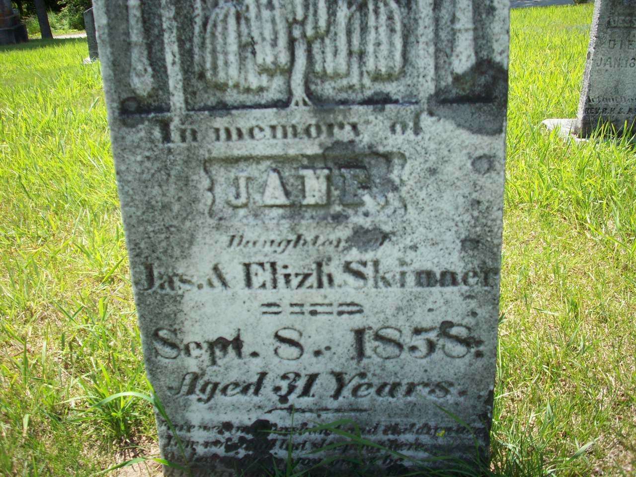 Jane Skinner was born in 1827; Date 1827 per Memorial - age 31 at death Sep 8 1858.1 She died on 8 September 1858 at Ontario; Date Sep 8 1858 per Memorial.1 She was buried on 10 September 1858 at Castleton Cemetery, Castleton, Northumberland Co., Ontario; Memorial: (See Exhibit) In Memory of; Jane; Daughter of; Jas. & Elizh. Skinner; Sept. 8, 1858; Aged 31 Years (Castleton Cemetery, Castleton, Jul 23 2009.)1