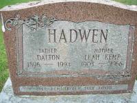 Dalton Hadwen was born on 20 April 1896 at Vaughn Twp., York Co., Ontario; Date 1896 per Memorial.Date Apr 20 1896 & location Vaughn Twp. per GEDCOM of Cheryl (Kemp) Taber, Aug 14 2012.1,2 He married Leah Benyol Kemp, daughter of Wilbert Stanley Kemp and Mary Emily Coulter, circa 1925; per GEDCOM of Cheryl (Kemp) Taber, Aug 14 2012.1 Dalton Hadwen was buried in 1994 at Greenwood Cemetery, Smithfield, Northumberland Co., Ontario; Memorial: (see Exhibit) HADWEN; Father; Dalton; 1896 - 1994; Mother; Leah Kemp; 1903 - 1966 (Greenwood Cemetery, Smithfield, image by Dan Buchanan, Jun 30 2013.)2 He died in 1994 at Ontario; Date 1994 per Memorial.2