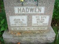 Date 1890 per Memorial. Date 1892 & location Ont. per 1931 Census. Date Aug 19 1890 & location Shewrood per GEDCOM of Cheryl (Kemp) Taber, Aug 14 2012.1,3,4,2 He married Hilda Kemp, daughter of Wilbert Stanley Kemp and Mary Emily Coulter, on 15 November 1924 at Swift Current, Saskatchewan; per GEDCOM of Cheryl (Kemp) Taber, Aug 14 2012.1 John "Herbert" Hadwen appeared on the census of 1931 at Sec 6 Twp. 28 Range 19 3M, Hillsburgh, Kindersley Dist., Saskatchewan; Age 39 at 1931 Census: Hadwen, John Herbert, 39, b. Ont., p.b. Ont., Eng., UC, grain farmer, married; Hilda, 27, b. Ont., p.b. Ont., Eng., UC, married; James Herbert, 4, b. Sask, p.b. Ont., Eng., UC, son; Clarence Stanley, 2, b. Sask, son; Robert Edward, 1, son (1931 Census: Hillsburgh, Kindersley Dist., Saskatchewan, dist. 192, sub-dist. 63, pg. 6, line 3 - Section 6 Township 28 Range 19 3rd Meridian - ancestry.ca.)4 He lived in 1937 at Ontario; "Dates per his son, James Herbert Hadwen: Herb Hadwen came to Ontario with his family in the fall of 1937 from Brock, Saskatchewan. He farmed four different places near Castleton and Centerton, Ontario, until the fall of 1943. He then moved to Brighton, Ontario, settled there and worked at R.C.A.F. Station in Trenton, Ontario, until he was forced to retire at the age of 69. John "Herbert" Hadwen was born Aug. 19, 1890, in Maple, Ontario. His parents were John Edward Hadwen and Hanah Dalton. Herb died Nov. 17, 1979, in Trenton, ON, and is buried at Smithfield, ON. Hilda died on October 24, 1988, and is also buried in Smithfield." per GEDCOM of Cheryl (Kemp) Taber, Aug 14 2012.1 He lived on 16 September 1960 at 8 Dundas St. (Lot 2), Brighton, Northumberland Co., Ontario; Land Registry Records (Executors Grant 25819) show that Gordon R. Locklin & Thomas E. Locklin (Executor of the Estate of Ann M. Locklin) granted "said lot", Lot 2, Dundas St. North, Brighton Village, Northumberland Co. to John H. Hadwen & Hilda Hadwen (Joint Tenants) for $7,500. ITS Date: Sep 16 1960. Reg'n. Date: Oct 14 1960. (Ontario Land Registry Records, Northumberland County, Brighton Village, Book 002, page 268 of 298, OnLand.ca.)5 He lived on 19 September 1960 at 8 Dundas St. (Lot 2), Brighton, Northumberland Co., Ontario; Land Registry Records (Mortgage 25978) show that John H. & Hilda Hadwen took a mortgage on "said lot", Lot 2, Dundas St. North, Brighton Village, Northumberland Co. from Lillian E. Goodrich in the amount of $5,500. ITS Date: Sep 19 1960. Reg'n. Date: Nov 2 1960. (Ontario Land Registry Records, Northumberland County, Brighton Village, Book 002, page 269 of 298, OnLand.ca.)5 He lived in 1968 at 40 Alice St., Brighton, Northumberland Co., Ontario; "110 Hadwen, Clarence, civil servant, 8 Dundas St." & "111 Hadwen, Mrs. Clarence - 8 Dundas St." & "112 Hadwen, Herbert., gentleman, 40 Alice St." & "113 Hadwen, Mrs. Herbert, 40 Alice St." Canada Voters Lists, 1968, Northumberland Co., Brighton Village, pg. 295 of 806, ancestry.ca.6 He died on 17 November 1979 at Trenton, Hastings Co., Ontario, at age 89; Date 1979 per Memorial. Date Nov 17 1979 & location Trenton per GEDCOM of Cheryl (Kemp) Taber, Aug 14 2012.1,2 He was buried on 19 November 1979 at Greenwood Cemetery, Smithfield, Northumberland Co., Ontario; Memorial: (see Exhibit) HADWEN; John H; (Herb); 1890-1979; His Wife; Hilda; Kemp; 1904-1988; Ron Herbert 1930 - 1998 (Greenwood Cemetery, Smithfield, image by Dan Buchanan, Jul 1 2013.)2