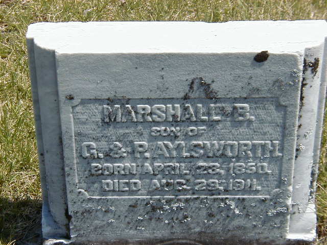 Marshal Benjamin Aylsworth was born on 21 April 1850 at Percy Twp., Northumberland Co., Ontario; Date Apr 21 1840 (mistake, s/b 1850) - age 61y 4m 8d at death Aug 29 1911. Date 1850 & location Ont. per 1871 Census. Date 1850 & location UC per 1861 Census. Date 1849 & location Cda. per 1851 Census.1,2,3,4 He appeared on the census of 1852 at Percy Twp., Northumberland Co., Ontario; Age 2 at 1851 Census: see George Aylsworth.2 He appeared on the census of April 1861 at Percy Twp., Northumberland Co., Ontario; Age 11 at 1861 Census: see George Aylsworth.4 He appeared on the census of April 1871 at Percy Twp., Northumberland Co., Ontario; Age 21 at 1871 Census: see George Aylsworth.1 He married Florence Stone, daughter of John Blair Stone and Ann Cory Woof, on 3 November 1881 at Percy Twp., Northumberland Co.`, Ontario; Date Nov 3 1881 & location Percy Twp. per family tree of BrownHartman on ancestry.com, Sep 12 2015.5 Marshal Benjamin Aylsworth died on 29 August 1911 at General Hospital, Sarnia, Lambton Co., Ontario, at age 61; Death Reg'n.#017269: Name: Marshal Benjamin Aylsworth; Date: Aug 29 1911; Age: 61y 4m 8d; born: Ont., Apr 21 1840; Parents: George Aylsworth & Polly Cummings, b. Ont; Phys.: F. b. Wilkinson; Inf.: J. W. Simpson, Sarnia; Reg'd.: Aug 30 1911; Cause: arterio sclerosis, several years; Reg'r.: J. D. Stewart (Ontario Death Registration, #017269-1911, ancestry.com.)6 He was buried on 2 September 1911 at Warkworth Cemetery, Warkworth, Northumberland Co., Ontario; Memorial: (See Exhibit) Marshall B; Son of; G. & P> Aylsworth; Born: April 28 1850; Died Aug. 29 1911 (Warkworth Cemetery, Warkworth, Jul 12 2009.)7
