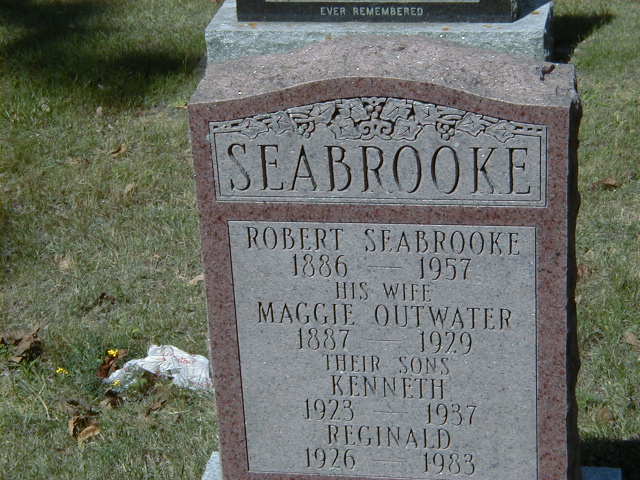 Robert Seabrooke was born on 24 June 1886 at Belmont Twp., Peterborough Co., Ontario; Late Birth Reg'n.#902271: Name: Robert Seabrooke; Date: June 24 1886; Place: Belmont Twp., Peterborough Co; Parents: William Seabrooke, farmer, Elizabeth Adams; Inf.: Samuel James Seabrooke, Trenton, brother; Reg'd.: Apr 19 1937, Trenton; Reg'r.: H. A. Graham (Ontario Birth Registration, #902271-1937, ancestry.ca) Date 1886 per Memorial. Date Jun 24 1886 & location Ont. rural per 1901 Census. Date 1887 & location Ont. per 1891 Census. Date 1886 per GEDCOM of Linda Smith, Sep 22 2012.1,2,6,4,5 He appeared on the census of 20 April 1891 at Belmont Twp., Peterborough East Co., Ontario; Age 4 at 1891 Census: see William Seabrook.4 He appeared on the census of 12 April 1901 at Belmont Twp., Peterborough East Co., Ontario; Age 14 at 1901 Census: see William Seabrook.5 He lived on 11 November 1909 at Castleton, Northumberland Co., Ontario; Residence Castleton per marr. reg'n.7 He married Margaret Jane "Maggie" Outwater, daughter of Lewis Outwater and Melinda Sophia Rupert, on 11 November 1909 at Cramahe Twp., Castleton, Northumberland Co., Ontario; Marriage Reg'n.#016880: Groom: Robert Seabrooke; Age: 22; Res.: Castleton; Status: bachelor; Occ.: Butcher; Rel.: CE; Parents: William Seabrooke, farmer & Elizabeth Adams; Bride: Maggie Outwater; Age: 23; Res.: Castleton; Status: spinster; Rel.: Meth; Parents: Lewis Outwater, farmer & Malinda Rubert; Wit.: Wm. B. Taylor, Allendale & Ethel M. Foster, Castleton; Date: Nov 11 1909; Performed by: A. H. Foster, Castleton; Reg'd.: Nov 11 1909; Reg'r.: C. A. Wilsn, Cramahe Twp. (Ontario Marriage Registration, #016880-1909, ancestry.ca) per GEDCOM of Linda Smith, Sep 22 2012.1,8 Robert Seabrooke married Jennie Hasher, daughter of James Hasher and Margaret McColl, on 26 August 1935 at Hastings, Northumberland Co., Ontario; Mmarriage Reg'n.#017619: Groom: Robert Seabrooke; Age: 49; Res.: Trenton; Born: Belmont Twp; Status: widower; Occ.: car man; Rel.: Anglican; Parents: William Seabrooke & Elizabeth Adams; Bride: Jennie Brown; Age: 50; Res.: Trenton; Born: Asphodel Twp; Status: widow; Occ.: house work; Rel.: UC; Parents: James ?Casher? & Margaret McColl; Expected Res.: Campbellford; Wit.: Mrs. R. W. Newell, Hastings & Miss Irene ?Swanick?, Hastings; Date: Aug 26 1935; Place: Hastings Village, Nothumberland Co; Performed by: Rev. F. W. Newell, Hastings, United; Sworn: Belleville, Aug 15 1935; Reg'r.: J. Wilfred Holmes, Belleville (Ontario Marriage Registration, #017619-1935, ancestry.ca.)9 Robert Seabrooke lived on 2 January 1937 at Trenton, Hastings Co., Ontario; Informant for Death Reg'n. of his son Kenneth Seabrooke.10 He was buried in 1957 at Mount Evergreeen Cemetery, Trenton, Hastings Co., Ontario; Memorial: (See Exhibit) SEABROOKE; Robert Seabrooke; 1886 - 1957; His Wife; Maggie Outwater; 1887 - 1929; Their Sons; Kenneth; 1923 - 1937; Reginald; 1926 - 1983 (Mount Evergreen Cemetery, Trenton, Aug 20 2005.)2 He died in 1957 at Ontario; Date 1957 per Memorial.2