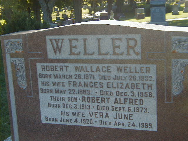 Robert Alfred Weller was born on 3 December 1913 at Trenton, Hastings Co., Ontario; Date Dec 3 1913 per Memorial. Date Dec 3 1913 per family tree of OneWorldTree on ancestry.com, Sep 22 2012.1,2 He married Ethel Seabrook, daughter of James Seabrook and Jessie Mildred Beatty, circa 1929; per family tree of OneWorldTree on ancestry.com, Sep 22 2012.1 Robert Alfred Weller married Vera June ? circa 1935 at Ontario; per Memorial.2 Robert Alfred Weller died on 6 September 1973 at Trenton, Hastings Co., Ontario, at age 59; Date Sep 6 1973 per Memorial. Date Sep 6 1973 & location Trenton per family tree of OneWorldTree on ancestry.com, Sep 22 2012.1,2 He was buried on 9 September 1973 at St. George Cemetery, Trenton, Hastings Co., Ontario; Memorial: (See Exhibit) WELLER; Robert Wallace Weller; Born March 26, 1871, Died July 26, 1933; His Wife Frances Elizabeth; Born May 22, 1883, Died Dec. 3. 1958; Their Son Robert Alfred; Born Dec 3, 1913, Died Sep 6 1973; His Wife; Vera Jane; Born June 4, 1920, Died Apr 24 1999 (St. George Cemetery, Trenton, Sep 24 2005.)2