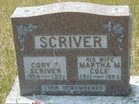 Cory Frederick Scriver was born on 14 October 1904 at Brighton Twp., Northumberland Co., Ontario; Birth Reg'n.# : Name: Cory Frederick Scriver; Date: Oct 14 1904; Parents: Corey E. Scriver & Eliza Harden.. pg. 2 missing .. (Ontario Birth Registration, #... , ancestry.com.)1 He married Martha Matilda "Tilly" Cole, daughter of Ezekiel Cole and Johanna Carmichael, on 8 October 1927 at Belleville, Hastings Co., Ontario; per family tree of margaretbrown1958 on ancestry.com, Nov 28 2012.2 Cory Frederick Scriver Cory Scriver appears in The Latimer Photos which were taken by Hugh Latimer during the early 1920s and late 1930s at his father's General Store in Orland. (The Latimer Photos, Codrington Public Library) circa 1930 at Brighton Twp., Orland, Northumberland Co., Ontario.3 He was buried in 1991 at Greenwood Cemetery, Smithfield, Northumberland Co., Ontario; Memorial: (See Exhibit) SCRIVER; Cory F; Scriver; 1904 - 1991; His Wife; Martha M; Cole; 1911 - 1993 (Greenwood Cemetery, Smithfield, Jun 5 2005.)4 He died in 1991 at Brighton Twp., Northumberland Co., Ontario; Date 1991 per Memorial. Date 1991 per family tree of margaretbrown1958 on ancestry.com, Nov 28 2012.2,4