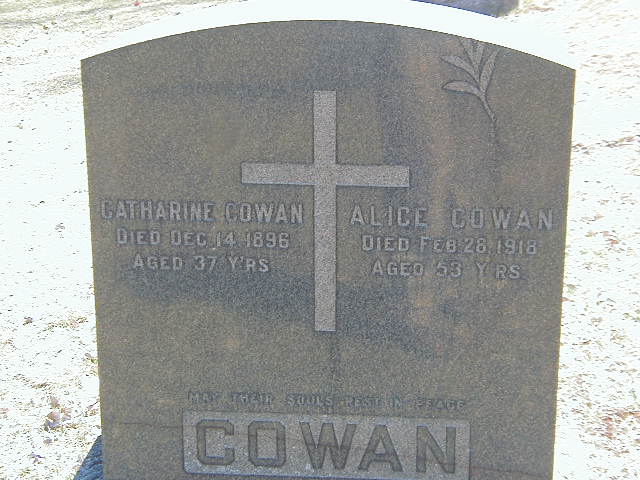 Alice Teresa O'Burn was born on 5 April 1864 at Seymour Twp., Northumberland Co., Ontario; Date 1864 per Memorial. Date March 1864 & location Syemour Twp. per Death Reg'n. - age 53y 11 m at death Feb 27 1918. Date Apr 1866 & location Ont. per 1911 Census. Date Apr 5 1863 & location Ont. rural per 1901 Census.1,3,2,4 As of circa 1890,her married name was Cowan.1 She married Patrick J. Cowan, son of Patrick Cowan and Ellen Casey, circa 1890 at Ontario; per 1901 & 1911 Census.1,3 Alice Teresa O'Burn appeared on the census of April 1901 at Brighton Twp., Northumberland Co., Ontario; Age 37 at 1901 Census: see Patrick J. Cowan.1 She appeared on the census of 1911 at Brighton Twp., Orland, Northumberland Co., Ontario; Age 45 at 1911 Census: see Patrick Cowan.3 She died on 27 February 1918 at Brighton Twp., Northumberland Co., Ontario, at age 53; Death Reg'n.#028575: Name: Alice Teresa Cowan; Date: Feb 27 1918; Age: 53y 11m; Res.: Brighton Twp; Born: Seymour Twp; Burial: Catholic Cemetery, Codrington; Status: married; Occ.: housewife; Parents: John O'Burn & Bridgit Galager; Cause: heart failure; Phys.: J. S. Anderson; Inf.: Patsy Cowan, Codrington; Reg'd.: Mar 8 1918; Reg'r; Fred O. Wade, Brighton Twp. (Ontario Death Registration, #028575-1918, ancestry.com) Date Feb 26 1918 per Memorial.5,4 She was buried on 1 March 1918 at Codrington Catholic Cemetery, Brighton Twp., Northumberland Co., Ontario; Memorial: (See Exhibit) Catharine Cowan; Died Dec 14 1896; Aged 37 Y'Rs; Alice Cowan; Died Feb 28 1918; Aged 53 Y'Rs; COWAN (Codrington Roman Catholic Cemetery, Brighton Twp.) Per Death Reg'n.2,4