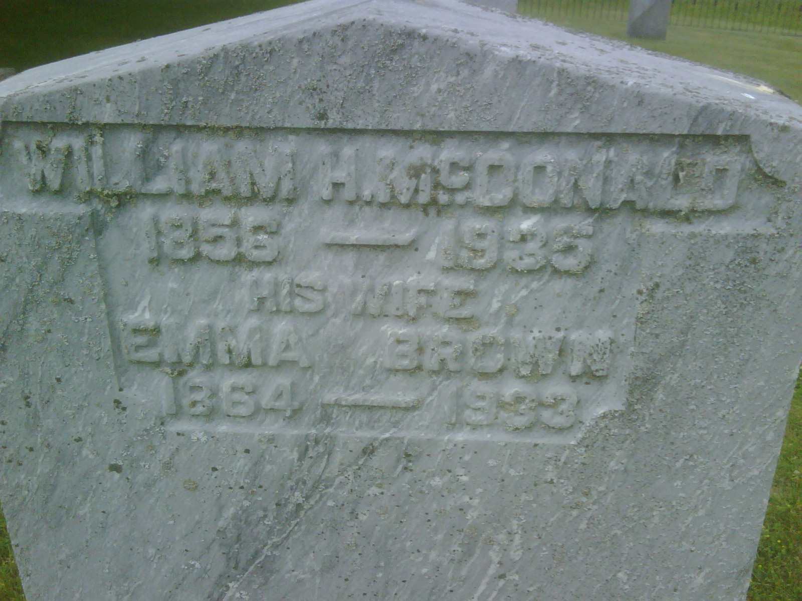 Emma Brown was born on 16 October 1864 at Canada West; Date 1864 per Memorial. Date Oct 16 1864 & location Ont. rural per 1901 Census. Date 1866 & location Ont. per 1891 Census. Date 1863 & location Ont. per 1881 Census. Date 1864 & location Cda. per marr. reg'n. per marriage reg'n. of daughter Marietta (McDonald) McMurray.1,2,3,4,5 She appeared on the census of April 1881 at Cramahe Twp., Northumberland East Co., Ontario; Date 1863 & location Ont. per 1881 Census.3 She married William Hiram McDonald, son of Alexander H. McDonald and Francis Catherine Filley, on 26 February 1885 at Brighton, Northumberland Co., Ontario; Marriage Reg'n.#007971: Groom: William Hiram McDonald; Age: 25; Res.: Colborne; Born: Ont; Status: bachelor; Occ.: Mechanic; Parents: Alexander & Francis McDonald; Bride; Emma Brown; Age: 21; Res.: Colborne; Born: Ont; Status: spinster; Parents: William & Mina Brown; Wit.: Ellen M. Scripture & Jesse K. Munro, Brighton; Date: Feb 26 1885; Place: Brigton Village; Rel.: Meth; Performed by: John Bredin?; Reg'r.: M. K. Lockwood, Brighton Village (Ontario Marriage Registration, #007971-1885, ancestry.ca) per marriage reg'n. of daughter Marietta (McDonald) McMurray. Date Feb 26 1885 & location Brighton per family tree of revdocray on ancestry.ca, Mar 2 2019.6,7 Emma Brown lived on 26 February 1885 at Colborne, Northumberland Co., Ontario; Residence Colborne per marr. reg'n.1 As of 26 February 1885,her married name was McDonald.1 She appeared on the census of 28 April 1891 at Colborne, Northumberland East Co., Ontario; Age 25 at 1891 Census: see William H. McDonald.5 She appeared on the census of 6 April 1901 at Colborne, Northumberland East Co., Ontario; Age 36 at 1901 Census: see William H. McDonald.4 She died in 1933; Date 1933 per Memorial.2 She was buried in 1933 at Salem Cemetery, Cramahe Twp., Northumberland Co., Ontario; Memorial: (see Exhibit) William H. McDonald; 1856 - 1935; His Wife; Emma Brown; 1864 - 1933 (Salem Cemetery, Cramahe Twp., July 6 2009.)2