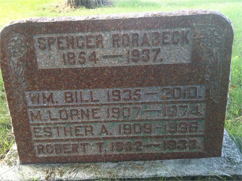 Date Oct 6 2010 per family tree of kashina on ancestry.com, Jul 2 2013.1 He was buried on 9 October 2010 at Cherry Valley Cemetery, Athol Twp., Cherry Valley, Prince Edward Co., Ontario; Memorial: (See Exhibit) Spencer Rorabeck; 1854 - 1937; Wm Bill 1935 - 2010; M. Lorne 1907 - 1974; Esther A. 1909 - 1996; Robert T. 1932 - 1932 (Cherry Valley Cemetery, Athol Twp., Prince Edward Co. - image from ancestry.com (per family tree of kashina on ancestry.com, Jul 2 2013.) per GEDCOM of Cheryl (Kemp) Taber, July 2 2013.1