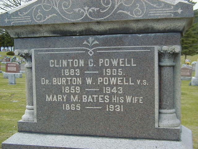 Clinton C. Powell was born in 1883 at Murray Twp., Northumberland Co., Ontario; Date 1883 per Memorial.1 He was buried in 1905 at Stockdale Cemetery, Stockdale, Northumberland Co., Ontario; Memorial: (See Exhibit) Clinton C. Powell; 883 - 1905; Dr. Burton W. Powell v.s; 1859 - 1943; Mary M. Bates His Wife; 1865 - 1931 (Stockdale Cemetery, Stockdale, May 21 2005.)1 He died in 1905 at Ontario; Date 1905 per Memorial.1