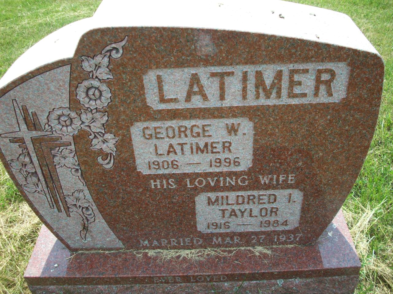 Mildred I. Taylor was born in 1916 at Ontario; Date 1916 per Memorial.1 As of 27 March 1937,her married name was Latimer.1 She married George William Latimer, son of William James Latimer and Zoa "May" Phillips, on 27 March 1937 at Ontario; Date Mar 27 1937 per Memorial.1 Mildred I. Taylor was buried in 1984 at Lakeport Cemetery, Haldimand Twp., Lakeport, Northumberland Co., Ontario; Memorial: (See Exhibit) LATIMER; George W; Latimer; 1906 - 1996; His Living Wife; Mildred I; Taylor; 1916 - 1984; Married Mar 27 1937 (Lakeport Cemetery, Haldimand Twp., May 29 2012.)1 She died in 1984 at Ontario; Date 1984 per Memorial.1