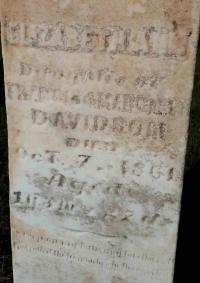 CemSearch: Name: Elizabeth Ann Davidson; Born: - ; Died: Oct 7 1861; Age: 1y 8m 27d; ID: CARMAN30; No other names; Cemetery: Craman Cemetery, Conc 3, Lot 27, Brighton Twp., Northumberland Co; Daughter of Francis and Margaret Davidson. Death Year Questionable. (https://www.cemsearch.ca/burial/?pid=CARMAN30%5E0_.2,3