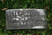 Peter Davidson was born on 18 September 1818 at Upper Canada; Date Sep 18 1818 per Memorial. Date 1819 & location US per Death Reg'n. Date 1821 & location Ont. per 1891 Census. Date 1819 & location Ont. per 1881 Census. Date 1819 & location Ont. per 1871 Census. Date 1819 & location UC per 1861 Census. Date 1816 & location Cda. per 1851 Census. Date 1821 & res. Cramahe per marriage list.
