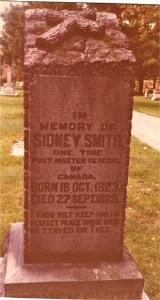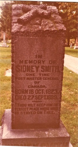 General Bibliography © 1982–2013 University of Toronto/Université Laval (http://www.biographi.ca/en/bio/smith_sidney_11E.html) in 1857 at Northumberland Co., Canada West. He appeared on the census of April 1861 at Hamilton Twp., Northumberland Co., Canada West; Age 35 at 1861 Census: Smith, Sidney, 35, b. UC, CE, Postmaster General, married; Mary A., 34, b. UC, CE, married; Henry, 15; Sidney, 11; John D. S., 8; Fanny, 6; William, 4; Frederick, 2; Page, Charlotte, 35, b. b. Eng., CE, Cook, single; Andrews, Catherine, 20, b. Eng., CE, House Maid, single; Phalin, Norah, 17, b. Ireland, R.C., Nurse, single; Herbert, John, 57, b. Scotland, F.C. of S., lab., married; Mutton, Willian, 30, b. Eng., Ce, lab., married; Bennett, Mariah, 32, b. UC, CE, single (1861 Census: Hamilton Twp., Northumberland Co., pg. 821 of 899, line 20 - ancestry.com.)3 He appeared on the census of April 1871 at Hamilton Twp., Northumberland Co., Ontario; Age 47 at 1871 Census: Smith, Sidney, 47, b. Ont., Eng., CE, Barrister at Law, married; Mary Ann, 45, b. Ont., Eng., Ce, married; Frances(f), 14, b. England, Eng., CE; William, 12, b. Ont., Eng., CE; Frederic, 10; Sidney, 20; John, 17; Dunn, Catherine, 18, b. Ont., Eng., Catholic, servant, single; Smith, Henry, 24, b. England, Eng., CE, servant, single (1817 Census: Hamilton Twp., Northumberland Co., dist. 54, sub-dist. A-4, pg. 32, line 19 - ancestry.com.)2 He died on 27 September 1889 at Cobourg, Northumberland Co., Ontario, at age 65; Date Sep 27 1889 per Memorial. Date Sep 18 1889 & location Cobourg per family tree of LindaSusanSmith on ancestry.com, Oct 20 2013.1,4 He was buried on 30 September 1889 at St. John Anglican Church Cemetery, Port Hope, Durham Co., Ontario; Memorial: (see Exhibit) In; Memory of; Sidney Smith; One Time; Post Master General; of; Canada; Born 16 Oct. 1823; Died 27 Sept. 1889 (image of memorial on ancestry.com per LindaSusanSmith, Oct 20 2013.)4,1