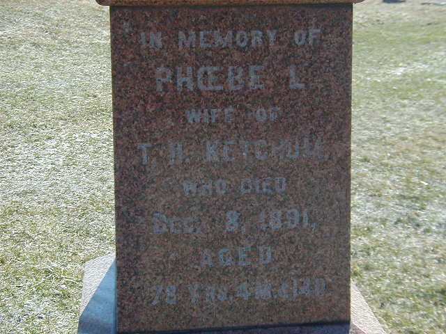 Phoebe Lavinia Lawson was born on 21 July 1812 at U.S.A; Date July 21 1813 per Memorial - age 78y 4m 17d at death Dec 8 1891. Date 1814 & location USA per 1871 Census. Date 1814 & location USA per 1861 Census. Date 1813 & location USA per 1851 Census. Date Jul 24 1812 & location USA per Lawson Book, pg. 212.1,2,3,4,5 She was baptized on 1 September 1812 at Wappingers Creek, New Hamburg, Dutchess Co., New York, U.S.A; per Lawson Book, pg. 212.1 As of 17 January 1833,her married name was Ketchum.1 She married Thaddeus Hiram Ketchum, son of Thadeus Ketchum Jr. and Elizabeth Haukinson, on 17 January 1833 at Prince Edward Co., Upper Canada; per Lawson Book, pg. 212.1 Phoebe Lavinia Lawson appeared on the census of 1852 at Brighton Twp., Northumberland Co., Canada West; Age 38 at 1851 Census: see Thadeus Ketchum.2 She appeared on the census of April 1861 at Brighton Twp., Northumberland Co., Canada West; Age 47 at 1861 Census: see T. H. Ketchum.3 She lived on 24 March 1868 at Village Lot 35, Prince Edward St. West, Brighton, Northumberland Co., Ontario; Land Registry Records (Release A502) show that Phebe L. Ketchum released "1 3/4 acres supposed to be this lot", of Village Lot 42, Main Street South, Brighton Village, Northumberland Co. to Maitland P. Ketchum & others. ITS Date: Mar 24 1868. Reg'n. Date: Apr 20 1868. (Ontario Land Registry Records, Brighton, Book 004, Pg 237 of 399, page copied from OnLand.ca by Dan Buchanan, Apr 25 2023.)6 She appeared on the census of April 1871 at Brighton Twp., East Northumberland Co., Ontario; Age 57 at 1871 Census: Kechum, Phoebe, 57, b. USA, Dutch, WM, widow; Marshal B., 14, b. Ont., WM, Dutch; ?Harvey?, David, 17, b. Ont., Eng., WM; Brown, John, 80, b. Scotland, Scot., Pres., lab., single (1871 Census: Brighton Twp., East Northumberland Co., dist. 55, sub-dist. 1, pg. 61, line 14 - ancestry.ca.)5 She died on 8 December 1891 at Ontario at age 79; Date Dec 8 1891 per Memorial.4 She was buried on 10 December 1891 at Mount Hope Cemetery, Brighton, Northumberland Co., Ontario; Memorial: (See Exhibit) In Memory of; Phoebe L; Wife of; T. H. Ketchum; Who Died; Dec. 8, 1891; Aged; 78 Y'rs., 4 M. & 17 D. (Mount Hope Cemetery, Brighton, Apr 2 2006.)4