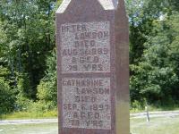 CemSearch: Name: Peter Lawson; Born: - ; Died: Aug 31 1889; Age: 78y; ID: MTHOPE144; Other name: Lawson, Catherine ( -1897); Cemetery: Mount Hope Cemetery, Conc A, Lot 35, Brighton Twp., Brighton Village, Northumberland Co., Sec 1 Row 8; Note: Husband of Catherine. (Back of Stone Reads 'Embury.') (https://www.cemsearch.ca/burial/?pid=MTHOPE144%5E0.)3,4