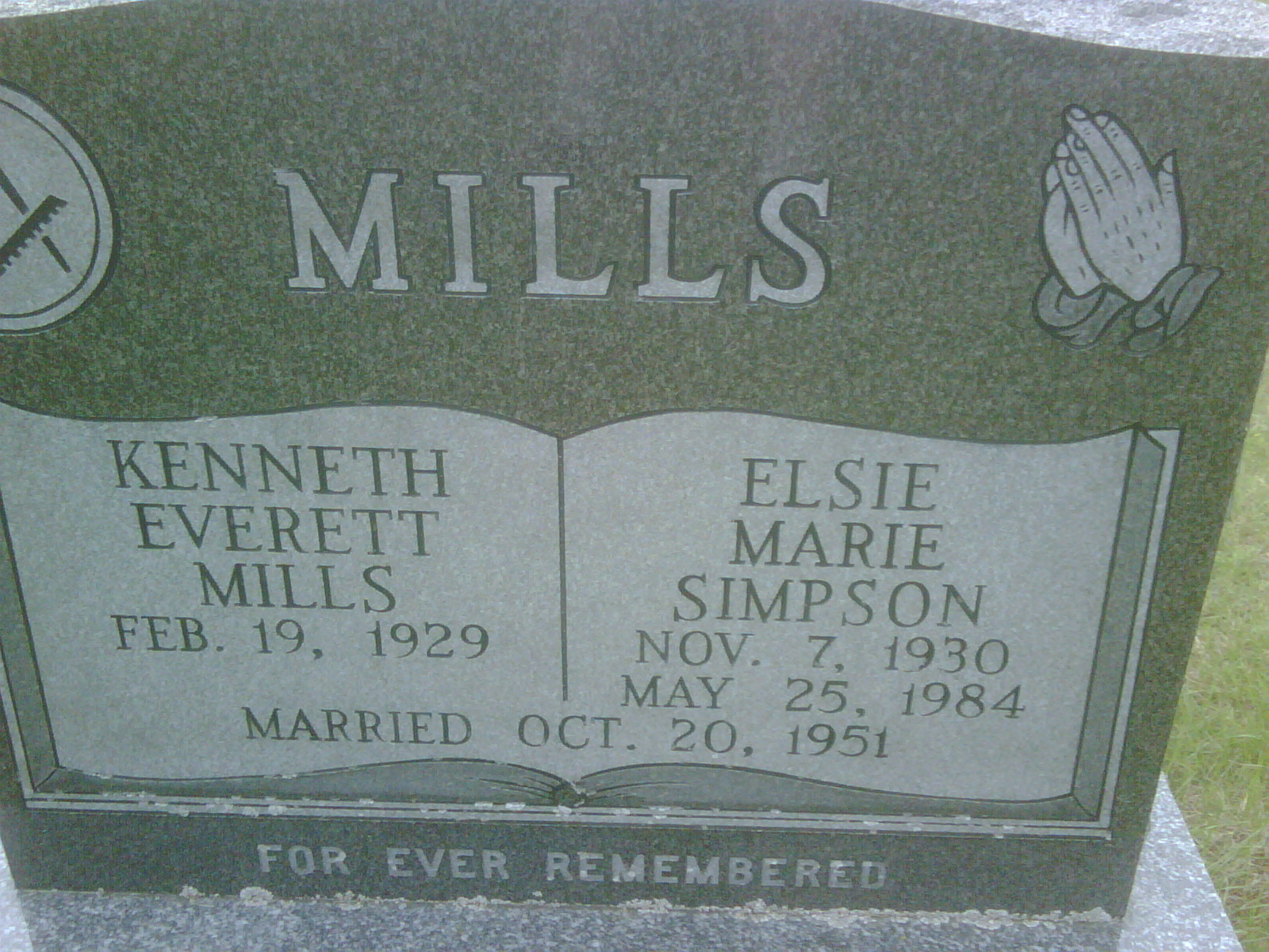 CemSearch: Name: Elsie Marie Mills; Maiden: Simpson; Born: Nov 7 1930; Died: May 25 1984; ID: SALEM0809; Other names: Mills, Kenneth Everett (1929- ); Cemetery: Salem Cemetery, Conc 1, Lot 21, Cramahe Twp., Village of Salem, Northumberland Co., Sec 4 Row 11 Plot 8; Note: Married October 20, 1951. Wife of Kenneth E. Mills. (https://www.cemsearch.ca/burial/?pid=SALEM0809%5E1.)3,2