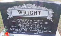 CemSearch: Name: James Clare Wright; Born: Jun 25 1911; Died: Oct 27 1972; Age: 61y 4m; ID: MTHOPE948; Other names: Wright, Ethel Helena [Craig] ( - ); Cemetery: Mount Hope Cemetery, Conc A, Lot 35, Brighton Twp., Brighton Village, Northumberland Co., Sec 3 Row 16; Note: Husband of Ethel Helena Craig. (https://www.cemsearch.ca/burial/?pID=MTHOPE948%5E0.)3,5