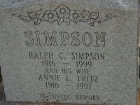 "Simpson: In Brighton, on Saturday, Dec. 23, 1916, to Mr. and Mrs. Frank Simpson, a son." from pg. 037 of Newspaper Clippings, a collection donated by Shawnee Spencer to the Brighton Digital Archives, 2022.1,2,4,3 He appeared on the census of 3 June 1921 at Brighton Twp., Northumberland Co., Ontario; Age 4 at 1921 Census: see Frank Simpson.1 He appeared on the census of 4 June 1931 at Conc 2 Lot 4, Brighton Twp., Brighton, Northumberland Co., Ontario; Age 14 at 1931 Census: see Frank Simpson.3 He lived in 1940 at Brighton, Northumberland Co., Ontario; "150 Simpson, Ralph, farmer, Brighton" Canada Voters List, 1940, Northumberland Co. - ancestry.com.5 He married Annie Louise Fritz, daughter of William Arthur Fritz and Elma E. "Nellie" Sherman, on 23 September 1944 at Ontario; per Memorial. Date Sep 23 1944 per family tree of keepingbusy2902 on ancestry.ca, Jan 1 2023.6,2 Ralph Curtis Simpson lived in 1945 at Brighton, Northumberland Co., Ontario; "165 Simpson, Ralph, farmer, Brighton" Canada Voters List, 1945, Northumberland Co. - ancestry.com.5 He lived in 1958 at R. R. # 2, Brighton, Northumberland Co., Ontario; "267 Simpson, Ralph, C.N.R. Railway, R.R. 2, Brighton" Canada Voters List, 1958, Northumberland Co. - ancestry.com.5 He lived in 1963 at Brighton, Northumberland Co., Ontario; "241 Simpson, Ralph, lineman, Brighton" Canada Voters List, 1963, Northumberland Co. - ancestry.com.5 He lived in 1965 at 80 Percy St., Brighton, Northumberland Co., Ontario; "210 Simpson, Ralph, Public Utilities, 80 Percy St., Brighton" Canada Voters List, 1965, Northumberland Co. - ancestry.com.5 He lived on 1 May 1965 at Conc 2 Lot 4, Brighton Twp., Northumberland Co., Ontario; Land Registry Records (Grant 38388) show that Ralph C. Simpson & wife granted ?north part of south half, lot 4, conc 2, Brighton Twp., Northumberland Co. to Ralph C. Simpson & Annie L. Simpson (Joint Tenants) for nat. love & aff. & $1. ITS Date: May 1 1965. Reg'n. Date: Jun 16 1965. (Ontario Land Registry Records, Northumberland Co., Brighton Twp., Conc 02, pg. 058 of 317, page copied from OnLand.ca by Dan Buchanan, Apr 11 2020.)7 He lived in 1997 at 62 Percy St., Brighton, Northumberland Co., Ontario; Name: Ralph C. Simpson; Address: 62 Percy St., Brighton; Phone: 613-475-2213; Years: 1995, 1996, 1997 (Canadian Phone and Address Lists, ancestry.com.)5 He died on 6 December 1999 at Northumberland Co., Ontario, at age 82; Date 1999 per Memorial. Date Dec 6 1999 & location Northumberland Co. per family tree of keepingbusy2902 on ancestry.ca, Jan 1 2023.6,2 He was buried on 9 December 1999 at Woods Cemetery, Cramahe Twp., Northumberland Co., Ontario; Memorial: (See Exhibit) SIMPSON; Ralph C. Simpson; 1916 - 1999; And His Wife; Annie L. Fritz; 1916 - 1997 (Woods Cemetery, Cramahe Twp., Jul 3 2004.)6