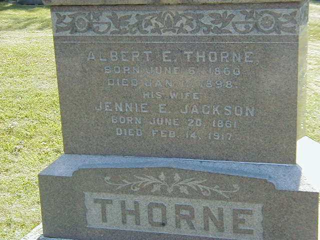 Jennie Elizabeth Jackson was born on 20 June 1861 at Hastings, Northumberland Co., Canada West; Date June 20 1861 per Memorial & CemSearch. Date June 5 1861 & location Hastings Village, Northumberland Co. per Death Reg'n. - age 55y 8m 9d at death Feb 14 1917. Date June 18 1860 & location Ont. rural per 1901 Census. Date 1862 & location Ont. per 1891 Census. Date 1862 & location Hastings per marr. reg'n.1,5,2,3,6,7 She lived on 27 March 1888 at Hastings, Northumberland Co., Ontario; Residence Hastings per marr. reg'n.1 As of 27 March 1888,her married name was Thorne.1 She married Albert Edward Thorne, son of George Charles Thorne and Esther Smith, on 27 March 1888 at Hastings, Northumberland Co., Ontario; Marriage Reg'n.#008336: Groom: Albert Edward Thorne; Age: 27; Res. & Born: Brighton Twp; Status: bachelor; Occ.: farmer; Parents: Geo. Charles Thorne & Esther Smith; Bride: Jeannie E. Jackson; Age: 26; Res. & Born: Hastings; Status: spinster; Parents: Geo. T. Jackson & Ann Elliot; Wit.: David Anderson, Toronto & Alice M. Jackson, Hastings; Date: Mar 27 1888; Place: Hastings; Rel.: Pres; Performed by: Rev. D. A. Thomson; Reg'r.: John Sharpe, Hastings (Ontario Marriage Registraiton, #008336-1888, ancestry.com.)8 Jennie Elizabeth Jackson appeared on the census of April 1891 at Brighton Twp., Northumberland Co., Ontario; Age 29 at 1891 Census: see Albert Thorne.5 She lived on 12 January 1898 at Brighton Twp., Northumberland Co., Ontario; Informant for Death Reg'n. of her husband Albert Edward Thorne.6 She lived in 1900 at Conc 4 Lot 2, Brighton Twp., Hilton, Northumberland Co., Ontario; "The Arthur Chatten farm, lot 2 or 3, concession 5, had 365 acres of good farmland. The two-storey frame house was built in 1900 for the previous owners, Mr. and Mrs. Albert Thorne. It still stands on Chatten Road, and the house is painted blue. The building was once a barn. When the house on the property burned, the owners moved the barn into place and renovated it for a home." from Page 171 of Brighton Township, by Florence Chatten, Epic Press, 2009