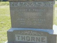 CemSearch: Name: Jennie E. Thorne; Maiden: Jackson; Born: June 20 1861; Died: Feb 14 1917; ID: MTHOPE389; Other names: Macklam, Aleck Thorne (1919- ), Macklam, Florence Gertrude [McCourt](1923-1985), Sherwood, Jean C. M. B. [Thorne](1889-1980), Thorne, Albert E. (1860-1898), Thorne, Esther [Smith](1833-1919), Thorne; Cemetery: Mount Hope Cemetery, Brighton, Sec 1 Row 20 (https://www.cemsearch.ca/burial/?pid=MTHOPE389%5E2)