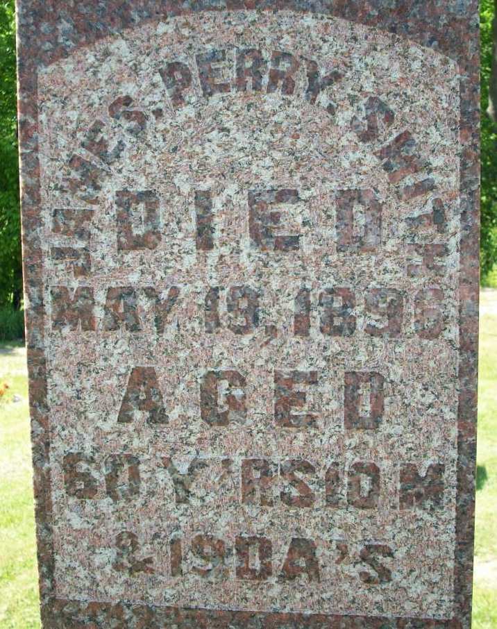 James "Perry" Smith was born on 30 June 1835 at Cramahe Twp., Northumberland Co., Upper Canada; Date June 30- 1835 per CemSearch - age 60y 10m 19d at death May 19 1896. Date 1837 & location Ont. per 1891 Census. Date 1836 & location Ont. per 1881 Census. Date 1836 & location Ont. per 1871 Census. Date 1831 & location UC per 1861 Census. Date 1834 & location Cda. per 1851 Census. per family tree of Eudene123 on ancestry.com, Dec 18 2013.1,2,3,4,5,7,8 He appeared on the census of April 1852 at Brighton Twp., Northumberland Co., Canada West; Age 17 at 1851 Census: see James Smith.4 He married Mary Jane Bennett, daughter of Samuel Bennett and Eliza Milligan, before 1858 at Northumberland Co., Canada West; Date c. 1858 per 1861 Census 0 dau. 1859. per family tree of Eudene123 on ancestry.com, Dec 18 2013.1,7 James "Perry" Smith appeared on the census of April 1861 at Brighton Twp., Northumberland Co., Canada West; Age 30 at 1861 Census: Smith, Perry, 30, b. UC, EM, farmer, married; Mary J., 23, b. UC, EM, married; Alcie, 2 (1861 Census: Brighton Twp., Northumberland Co., pg. 381 of 899, line 1 - ancestry.ca.)7 He lived on 17 May 1865 at Conc 3 Lot 6, Brighton Twp., Northumberland Co., Canada West; Land Registry Records (B&S C356) show that James Smith sold 50 acres of the north east quarter of lot 6, conc 3, Brighton Twp. to James P. Smith. ITS Date: May 17 1865. Reg'n. Date: Mary 12 1866. (Ontario Land Registry Records, Northumberland Co., Conc 3, Lot 6, pg. 163 of 320, pg. 01, page copied from OnLand.ca by Dan Buchanan, Apr 13 2020.)9 He appeared on the census of April 1871 at Brighton Twp., Northumberland East Co., Ontario; Age 35 at 1871 Census: Smith, J.P.(m), 35, b. Ont., Irish, EM, farmer, married; Mary J., 32, b. Ont., Eng., EM, married; Ella J., 12, b. Ont., Irish; Emma O., 8; Norma E., 6; Stanley, 3/12 - Jany (1871 Census: Brighton Twp., Northumberland East Co., dist. 55, sub-dist. A-1, pg. 4, line 20 - ancestry.ca.)8 He lived in 1878 at Conc 3 Lot 6, Brighton Twp., Northumberland Co., Ontario; Belden County Atlas: Name: Smith, J.P; Nat.: Cda; Bus.: farmer; Year Settled: 1836; P.O.: Hilton; Township: Brighton; County: Northumberland; Conc & Lot: II, 6 - 50 acres (Belden County Atlas Project, Brighton Twp., Northumberland Co., Smith - (https://digital.library.mcgill.ca/countyatlas/showrecord.php?PersonID=26178.)10 He appeared on the census of April 1881 at Brighton Twp., Northumberland East Co., Ontario; Age 45 at 1881 Census: Smith, Perry, 45, b. Ont., Irish, CM, farmer, married; Mary, 42, b. Ont., Eng., CM, married; Olivia, 18, b. Ont., Irish, CM, single; Norma, 16; Stanley, 10 (1881 Census: Brighton Twp., Northumberland East Co., dist. 123, sub-dist. C-1, pg. 1, line 17 - ancestry.ca.)5 He appeared on the census of April 1891 at Brighton Twp., Northumberland East Co., Ontario; Age 54 at 1891 Census: Smith, Perry, 54, b. Ont., p.b. Ireland & Ont., Meth., farmer, married; Mary Jane, 52, b. Ont., p.b. England, Meth., married; Stanley, 20, b. Ont., p.b. Ont., Meth., school teacher, single (1891 Census: Brighton Twp., Northumberland East Co., dist. 98, sub-dist. a, pg. 5, line 21 - ancestry.ca.)3 He died on 19 May 1896 at Ontario at age 60; Date May 19 1896 per CemSearch.2 He was buried on 21 May 1896 at Mount Hope Cemetery, Brighton, Northumberland Co., Ontario; Memorial: (see Exhibit) James Perry Smith; Died; May 19, 1896; Aged; 60 Y'rs, 10 M; & 19 Da's (Mount Hope Cemetery, Apr 2 2006, by Dan)