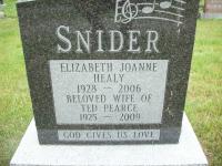 Elizabeth Joanne Healey was born in 1928; Date 1928 per Memorial. per Death Notice of Ted Pearce Snider.1,2 As of 19 July 1952,her married name was Snider.1 She married Ted Pearce Snider, son of Corey Snider and Emma Pearce, on 19 July 1952 at Toronto, York Co., Ontario; per Death Notice of Ted Pearce Snider. Date July 19 1952 & location Toronto per family tree of markjoannepearce1 on ancestry.ca, Dec 13 2021.1,3 Elizabeth Joanne Healey was buried in 2006 at Greenwood Cemetery, Brighton Twp., Smithfield, Northumberland Co., Ontario; Memorial: (see Exhibit) SNIDER; Elizabeeth Joanne; Healey; 1928 - 2006; Beloved Wife of; Ted Pearce; 1925 - 2009 (Greenwood Cemetery, Smithfield, July 1 2013, by Dan.)2 She died in 2006 at Ontario; Date 2006 per Memorial. per Death Notice of Ted Pearce Snider.2