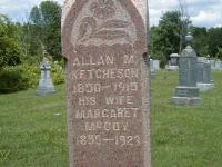Note: Ella R. was Ella Moore, a domestic in 1891 census.5 He appeared on the census of 1911 at Madoc Twp., Hastings East Co; Age 61 at 1911 Census: Ketcheson, Allen, 61, b. Ont. Aug 1849, Eng., Meth., farmer, married; Margaret, 55, b. Ont. Mar 1856, Eng., Meth., married; George, 32, b. Ont. Dec 1878, Eng., Meth., farmer, son, married; Agnes, 32, b. Ont. Dec 1878, Eng., Meth., daughter-in-lwa, married; Margaret, 2, b. Ont. Nov 1908, granddaughter (1911 Census: Madoc Twp., Hastings East Co., dist. 79, sub-dist. 10-2, pg. 11, line 15 - ancestry.com.)7 He died on 7 December 1915 at Madoc, Hastings Co., Ontario, at age 66; Death Reg'n.#015633: Name: Allen M. Ketcheson; Date: Dec 7 1915; Age: 66y 3m 22d; Place: Madoc Village; Born: Madoc Twp; Occ.: none; Status: married; Parents: Daniel Ketcheson & Almira Acker; Cause: asthenia; Phys.: Dr. Dafoe; Inf.: Hugh Ketcheson, Madoc; Reg'd.: Dec 7 1915; Reg'r.: R. R. Casement, Madoc Village (Ontario Death Registration, #015633-1915, ancestry.ca) Date 1915 per Memorial. Date 1915 per GEDCOM of Don & Jeanne Ross (djross@pastconnections.com) March 8 2014.3,4,12 He was buried on 9 December 1915 at Hazzards Corners Cemetery, Madoc Twp., Hazzards Corners, Hastings Co., Ontario; Memorial: (See Exhibit) Allan M; Ketcheson; 1850-1915; His Wife; Margaret; McCoy; 1855-1923 (Hazzards Corners Cemetery, Hazzards Corners, Madoc Twp., by Dan, June 23 2006) Date of death Dec 7 1915 & location Madoc Village per Death Reg'n.4,10
