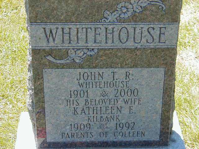 John Thomas R. Whitehouse was born in June 1901 at England; Date 1901 per Memorial. Date 1902 & location England per 1921 Census. Date Jun 1901 & location England per 1911 Census. Date 1902 & location England per mar. reg'n.1,4,2,3 He appeared on the census of 1 June 1911 at Brighton Twp., Northumberland Co., Ontario; Age 10 at 1911 Census: see John Whitehouse.1 He appeared on the census of 3 June 1921 at Brighton Twp., Northumberland Co., Ontario; Age 19 at 1921 Census: see John Whitehouse.4 He lived on 28 February 1934 at Brighton Twp., Northumberland Co., Ontario; Residence Brighton Twp. per marr. reg'n.2 He married Kathleen Estella Kilbank, daughter of Peter Harvey Kilbank and Mildred Samantha "Millie" Free, on 28 February 1934 at Brighton, Northumberland Co., Ontario; Marriage Reg'n.#017105: Groom: John Thomas R. Whitehouse; Age: 32; Res.: Brighton Twp; Born: England; Status: bachelor; Occ.: farmer; Rel.: United; Parents: John Whitehosue, b. Birmingham, England & Leah Messenger; Bride: Kathleen Estella Kilbank; Age: 24; Res.: Brighton Twp; Born: Murray Twp; Status: spinster; Occ.: at home; Rel.: United; Parents: Peter Kilbank & Mildred Free; Wit.: Samuel Whitehouse, & Maxcine Gertrude McGloughlin, Brighton; Date: Feb 28 1934; Place: Brighton Village; Performed by: Rev. W. S. Boyce, Brighton, United Church of Canada; Sworn: Trenton, Feb 23 1934; Reg'r.: R. J. O'Rourke, Trenton (Ontario Marriage Registration, #017105-1934, ancestry.ca.)5 John Thomas R. Whitehouse was buried in 2000 at Waite Cemetery, Cramahe Twp., Northumberland Co., Ontario; Memorial: (See Exhibit) WHITEHOUSE; John T. R; Whitehouse; 1901 - 2000; His Beloved Wife; Kathleen E; Kilbank; 1909 - 1992; Parents of Colleen (Waite Cemetery, Jul 3 2004.)3 He died in 2000 at Ontario; Date 2000 per Memorial.3