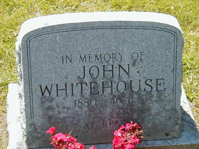 John Whitehouse was born in April 1880 at Birmingham, England; Date 1880 per Memorial. Date 1880 & location England per 1921 Census. Date Apr 1881 & location England per 1911 Census. per Birth Reg'n. of daughter Maude Whitehouse. Location Birmingham, England per Marriage Registration of his son, John Thomas R. Whitehouse.1,3,4,5,6 He married Leah Messenger on 29 January 1900 at Birmingham, England; Date Jan 29 1900 & location Birmingham, England per Birth Reg'n. of son Samuel Whitehouse. Date Jan 29 1900 & location Beriningham, England per Birth Reg'n. of daughter Charlotte Whitehouse. per Birth Reg'n. of daughter Maude Whitehouse.1 John Whitehouse immigrated in 1903 to Ontario; Immigration 1903 - per 1911 Census.3 He lived on 20 November 1906 at Conc 1 Lot 30, Brighton Twp., Northumberland Co., Ontario; Land Registry Records (Grant 7949) show that Edward H. Bate & wife sold "100 acres in the south half", Lot 30, Concession 1, Brighton Twp., Northumberland Co. to John Whitehouse & Harry A. Butcher for $5,000. ITS Date: Nov 20 1906. Reg'n. Date: Nov 21 1906. (Ontario Land Registry Records, Northumberland Co., Brighton Twp., Conc 01, pg. 225 of 307.)7 He appeared on the census of 1 June 1911 at Brighton Twp., Northumberland Co., Ontario; Age 30 at 1911 Census: Whitehouse, John, 30, b. England Apr 1881, immig. 1903, Eng., Meth., farmer, married; Leah, 29, b. England Apr 1882, immig 1904, Eng., Meth., married; John, 10, b. England Jun 1901, immig. 1904, Eng., Meth., son; Leah, 8, b. England Mar 1903, immig. 1904, daughter; Ellen, 6, b. Ont. Mar 1905, daughter; Maude, 4, b. Ont. Jul 1907, daughter; Charlotte, 2, b. Ont. Sep 1909, daughter (1911 Census: Brighton Twp., Northumberland Co., dist. 101-5, sub-dist. 16-2, pg. 1, line 1 - ancestry.com.)3 He appeared on the census of 3 June 1921 at Brighton Twp., Northumberland Co., Ontario; Age 41 at 1921 Census: Whitehouse, 41, b. England, p.b. Eng., immig. 1904, Eng., Meth., farmer, married; Leah, 40, b. Eng., p.b. Eng., immig. 1904, Eng., Meth., married; John, 19, b. Eng., p.b. Eng., Immig 1904, Eng., farmer's son, single; Leah, 18, b. Eng; Ellen, 16, b. Ont., p.b. Eng; Maude, 13; Charlotte, 11; Samuel, 9; Albert, 6; Phillip, 3; Barbara, 7/12 (1921 Census: Brighton Twp., Northumberland Co., dist. 107, sub-dist. 3, pg. 3, line 3 - ancestry.com.)4 He was buried in 1954 at Waite Cemetery, Cramahe Twp., Northumberland Co., Ontario; Memorial: (See Exhibit) In Memory of; John; Whitehouse; 1880 - 1954; At Rest (Waite Cemetery, Cramahe Twp., July 3 2004.)6 He died in 1954 at Ontario; Date 1954 per Memorial.6