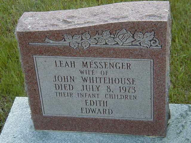 Leah Messenger was born in April 1882 at England; Date 1881 & location England per 1921 Census. Date Apr 1882 & location England per 1911 Census. per Birth Reg'n. of daughter Maude Whitehouse.1,2,3 She married John Whitehouse, son of Richard Whitehouse and Harriet Stevenson, on 29 January 1900 at Birmingham, England; Date Jan 29 1900 & location Birmingham, England per Birth Reg'n. of son Samuel Whitehouse. Date Jan 29 1900 & location Beriningham, England per Birth Reg'n. of daughter Charlotte Whitehouse. per Birth Reg'n. of daughter Maude Whitehouse.1 As of 29 January 1900,her married name was Whitehouse.1 Leah Messenger immigrated in 1904 to Ontario; Immigration 1904 - per 1911 Census.2 She appeared on the census of 1 June 1911 at Brighton Twp., Northumberland Co., Ontario; Age 29 at 1911 Census: see John Whitehouse.2 She appeared on the census of 3 June 1921 at Brighton Twp., Northumberland Co., Ontario; Age 40 at 1921 Census: see John Whitehouse.3 She died on 8 July 1973 at Ontario at age 91; Date July 8 1973 per Memorial.4 She was buried on 11 July 1973 at Greenwood Cemetery, Smithfield, Northumberland Co., Ontario; Memorial: (See Exhibit) Leah Messenger; Wife of; John Whitehouse; Died July 8, 1973; Their Infant Children; Edith; Edward (Greenwood Cemetery, Smithfield, July 9 2004.)4