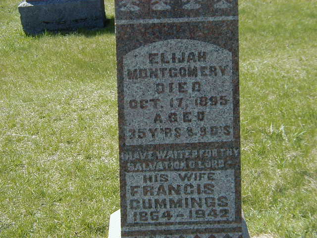 Elijah Montgomery was born on 8 October 1860 at Haldimand Twp., Northumberland Co., Canada West; Date Oct 8 1860 - age 35y 9d at death Oct 17 1895 - per Memorial. Date 1861 & location Ont. per 1891 Census. Date 1861 & location Ont. per 1881 Census. Date 1861 & location Ont. per 1871 Census.1,2,3,4 He appeared on the census of April 1871 at Haldimand Twp., Northumberland Co., Ontario; Age 10 at 1871 Census: see George Montgomery.1 He appeared on the census of April 1881 at Haldimand Twp., Northumberland Co., Ontario; Age 20 at 1881 Census: see George Montgomery.3 He married Frances Cummings before March 1891 at Ontario; per 1891 Census.2 Elijah Montgomery appeared on the census of April 1891 at Haldimand Twp., Northumberland Co., Ontario; Age 30 at 1891 Census: Montgomery, Elijah, 30, b. Ont., p.b. Ireland, Meth., married; Frances, 27, b. Ont., p.b. Ont., Meth., married (1891 Census: Haldimand Twp., Northumberland Co., dist. 99, sub-dist. C-5, pg. 7, line 18 - ancestry.com)(George Montgomery is just above and Solomon Leach is just below.2 He died on 17 October 1895 at Ontario at age 35; Date Oct 17 1895 per Memorial.4 He was buried on 19 October 1895 at Warkworth Cemetery, Warkworth, Northumberland Co., Ontario; Memorial: (See Exhibit) Elijah; Montgomery; Died; Oct. 17, 1895; Aged; 35 Y'RS & 9 D's; HIs Wife; Francis; Cummings; 1864-1942 (Warkworth Cemetery, Percy Twp., Jun 18 2007.)4