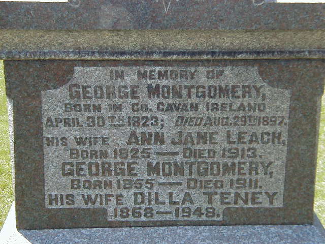 Note: The family of George Leach is right below; Ann Jane is a sister.3 He appeared on the census of April 1881 at Haldimand Twp., Northumberland Co., Ontario; Age 57 at 1881 Census: Montgomery, George, 57, b. Ireland, Irish, CM, farmer, married; Ann J., 55, b. Ireland, Irish, CM, married; George, 26, b. Ont., Irish, CM, farmer, single; Isaac, 24, b. Ont., Irish, CM, farmer, single; Elijah, 20; Thomas, 17; Nellie, 15; irvin, 12; Ingham, Albert, 2, b. Ont., Eng., CM; Joice, Maggie, 20, b. Ont., Eng., EM, servant (1881 Census: Haldimand Twp., Northumberland Co., pg. 71 of 113, line 3 - ancestry.com.)6 He lived on 8 March 1888 at Haldimand Twp., Northumberland Co., Ontario; Witness at marriage of James (John?) Haig and Sarah Leach (Sarah (Leach) Inglis)??8 He appeared on the census of April 1891 at Haldimand Twp., Northumberland Co; Age 68 at 1891 Census: Montgomery, George, 68, b Ireland, p.b. Irel., Meth., farmer, married; Ann, 65, b. Ireland, p.b. Irel., Meth., married; Thomas, 27, b. Ont., p.b. Ireland, Meth., farmer, single; William, 22, b. Ont., p.b. Irel., Meth., farmer, single (1891 Census: Haldimand Twp., Northumberland Co., dist. 99, sub-dist. C-5, pg. 7, line 11 - ancestry.com.)4 He died on 29 August 1897 at Northumberland Co., Ontario, at age 74; Date Aug 29 1897 per Memorial.7 He was buried on 2 September 1897 at Warkworth Cemetery, Warkworth, Northumberland Co., Ontario; Memorial: (See Exhibit) In Memory of; George Montgomery; Born in Cavan Co. Ireland; April 30th 1823; Died Aug 29th 1897; His wife Ann Jane Leach; Born - 1825 - Died 1913; George Montgomery; Born 1855 - Died 1911; His Wife Dilla Teney (Warkworth Cemetery, Percy Twp., Jun 18 2007.)7