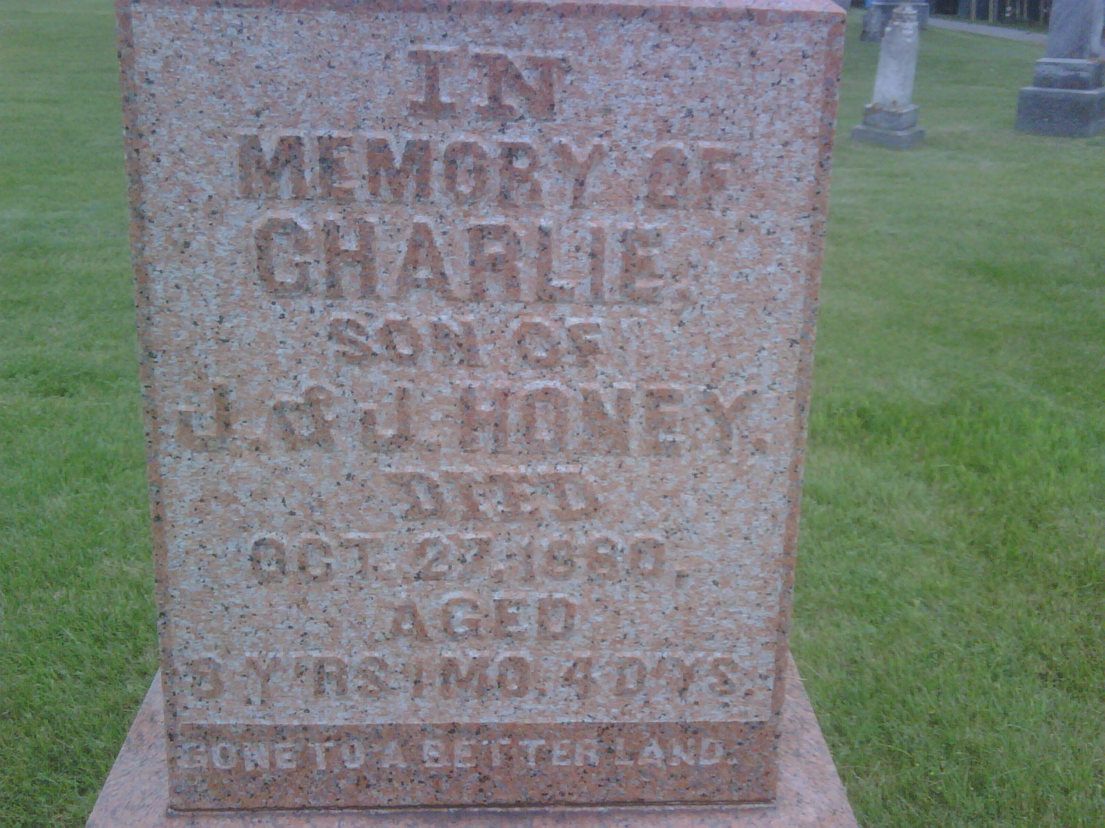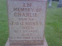 Charlie Honey was born on 27 September 1872 at Percy Twp., Northumberland Co., Ontario; Date Sep 27 1872 per Memorial & CEMSearch - age 8y 1m 4d at death Oct 27 1880.1,2 He died on 27 October 1880 at Percy Twp., Northumberland Co., Ontario, at age 8; Date Oct 27 1880 per CEMSearch.1 He was buried on 29 October 1880 at Warkworth Cemetery, Warkworth, Northumberland Co., Ontario; Memorial: (See Exhibit) In; Memory of; Charlie; son of; J. & J. Honey; Died; Oct. 27, 1880; Aged; 8 Y'rs. 1 MO. 4 D'Ys (Warkworth Cemetery, Warkworth, Jul 7 2009)