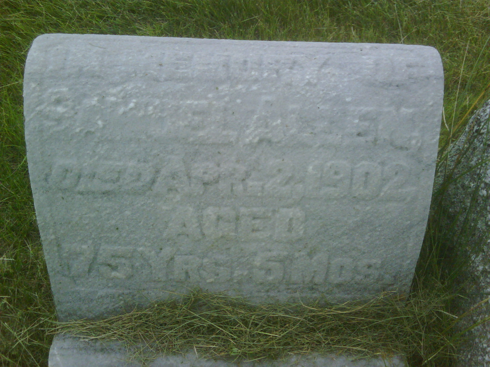 Samuel Allen was born on 26 August 1826 at Iddisleigh, Devon, England; Date Nov 1826 per Memorial - age 75y 5m at death Apr 2 1902. Date 1824 & location England per Death Reg'n. Date Aug 26 1825 & location England per 1901 Census. Date 1828 & location England per 1891 Census. Date 1826 & location England per 1881 Census. Date 1826 & location England per 1871 Census. Date 1826 & location England per 1861 Census. Date 1816 & location England per 1851 Census. Location England Death Reg'n. of son Thomas Alfred Allen. per marriage reg'n. of son Thomas Alfred Allen. Date 1826 & location Iddisleigh, Devon, England per family tree of wstableford on ancestry.com, Jul 7 2014.1,3,4,5,6,7,8,2,9,10 He was christened on 17 September 1826 at Iddisleigh, Devon, England; Christening Sep 17 1826, Iddisleigh, Devone, England per family tree of wstableford on ancestry.com, Jul 7 2014.2 He married Mary Ann Helson, daughter of William Helson and Patience Clifton, before 1845 at England; per 1851 Census. per marriage reg'n. of son Thomas Alfred Allen.1,7 Samuel Allen immigrated in 1851 to Ontario; Immigration 1851 per 1901 Census.5 He appeared on the census of 1852 at Percy Twp., Northumberland Co., Ontario; Age 35 at 1851 Census: see Thomas Helson (brother-in-law)(Age looks very much like 35 but must mean 25?)7 He appeared on the census of April 1861 at Otonabee Twp., Peterborough Co., Ontario; Age 35 at 1861 Census: Allen, Samuel, 35, b. England, WM, farmer, married; Mary Ann, 37, b. England, WM, married; ellen, 15, b. England, WM; Harriett, 10, b. CW, WM; William, 8; Thomas, 5; John, 3 (1861 Census: Otonabee Twp., Peterborough Co., pg. 344 of 593, line 28 - ancestry.com.)8 He appeared on the census of April 1871 at Otonabee Twp., Peterborough East Co., Ontario; Age 45 at 1871 Census: Allen, Samuel, 45, b. England, WM, Eng., farmer, married; Mary Ann, 45, b. England, Eng., WM, married; Ellen, 24, b. Ont., Eng., WM; Harriet, 20; William, 18; Thomas, 15; John, 13; Sarah Ann, 9; Martha, 7 (1871 Census: Otonabee Twp., Peterborough East Co., dist. 57, sub-dist. A-2, pg. 69, line 14 - ancestry.com.)9 He lived in 1878 at Conc 4 Lot 13, Percy Twp., Northumberland Co., Ontario; County Atlas Map: Name: Allen, Samuel; Township: Percy; County: Northumberland; Atlas Date: 1878; Conc & Lot: IV, 13 - 200 acres.11 He appeared on the census of April 1881 at Percy Twp., Northumberland East Co., Ontario; Age 55 at 1881 Census: Allen, Samuel, 55, b. England, Eng., CM, farmer, married; Mary Ann, 58, b. England, Eng., CM, married; Ellen, 29, b. England, Eng., CM, single; Harriet, 26, b. Ont., Eng., CM, single; William, 25, b. Ont., Eng., CM, farmer, single; Thomas, 23, b. Ont., Eng., CM, farmer, single; John, 22, b. Ont., Eng., CM, farmer, single; Anna, 18; Martha, 16 (1881 Census: Percy Twp., Northumberland East Co., dist. 123, sub-dist. f, pg. 6, line 17 - ancestry.com.)10 He appeared on the census of 22 April 1891 at Percy Twp., Northumberland Co., Ontario; Age 63 at 1891 Census: Allen, Samuel, 63, b. England, p.b. England, Meth., farmer, married; Mary, 65, b. England, p.b. England, Meth., married; Thomas, 32, b. Ont., p.b. Eng., Meth., tailor, son, single; Ellen, 38, b. England, p.b. England, Meth., daughter, single; John, 30, b. Ont., p.b. England, Meth., farmer, married; Allace, 26, b. Ont., p.b. Ont., Meth., married; William, 6; Herbert, 3; Harry, 5/12 (1891 Census: Percy Twp., Northumberland Co., dist. 98, sub-dist. H-2, pg. 23, line 8 - ancestry.com.)6 He appeared on the census of 5 April 1901 at Percy Twp., Northumberland Co., Ontario; Age 75 at 1901 Census: see John Allen (son.)5 He died on 2 April 1902 at Conc 9 Lot 12, Percy Twp., Northumberland Co., Ontario, at age 75; Death Reg'n.#018413: Name: Samuel Allen; Date: Apr 2 1902; Age: 78y; Res.: Conc 9, Lot 12?; Status: married; Occ.: farmer; Born: England; Cause: pleurisy and neuralgia of the heart; Phys.: N. D. Richards, MD; Inf.: S. Osborne; Reg'd.: Apr 2 1902; R. P. Hurlbut (Ontario Death Registration, #018413-1902, ancestry.com) Date Apr 2 1902 per Memorial.12 He was buried on 4 April 1902 at Warkworth Cemetery, Warkworth, Northumberland Co., Ontario; Memorial: (See Exhibit) In Memory of; Samuel Allen; Died Apr. 2, 1902; Aged; 75 Yr's, 5 Mos. (Warkworth Cemetery, Jun 5 2009.)4