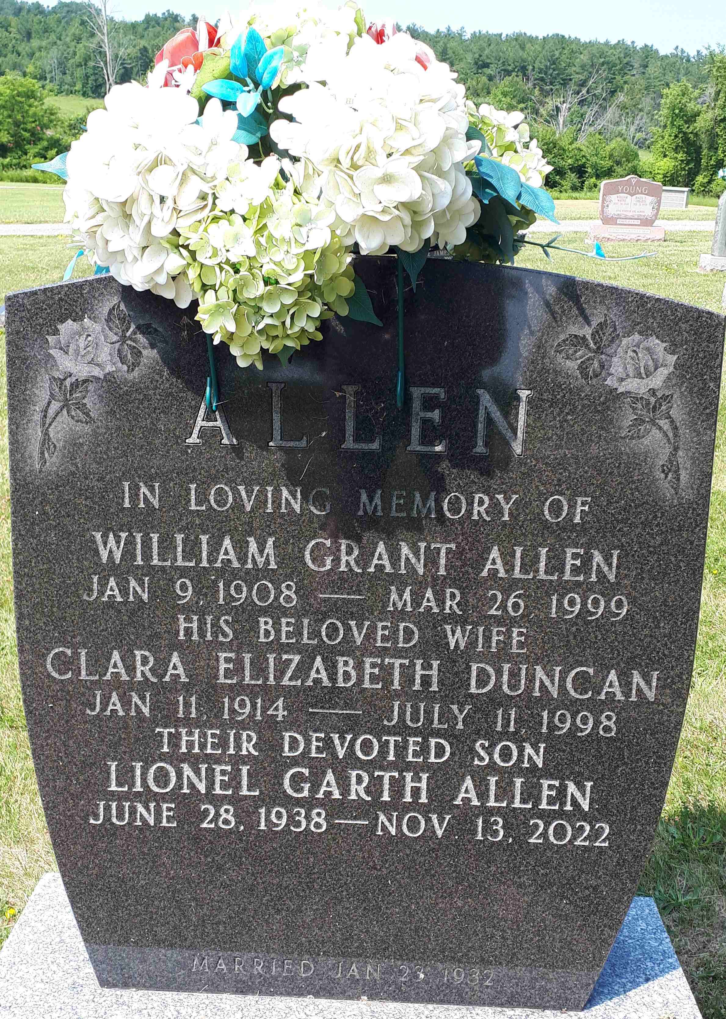 Note: This is the east part of the lot at Main St., now with a modern building for Allen Insurance.3 He "Hi Dan, I am the son of Elizabeth and Grant Allen who lived in Warkwoth all their married lives - 66 years; my brother, Bryce, still does and has the family insurance business. WE are near descendants of the Losie family; my dad's mother was Etta Losie Allen. My cousin, Pat (Honey) Lonergan, grandaughter of Ida Losie and younger sister of my Grandmother Allen, has recently moved to Brighton and read your article on Dr. King, who was a relative of the Losie's; in fact, our great grandfather Losie walked to Cobourg to the hanging. I'm certain you are extremely busy with things genealogical, but we both thought it would be fascinating to meet you for a coffee/drink and a chat, if at all possible. I live in Toronto but spend every summer in Warkworth. Please let me know if such a meeting might be possible. My number in Warkworth is 705-924-3960 and Pat's Brightoin number is 613-475-3316. Of course, I am available at this email address. Look forward to hearing from you! Garth Allen=" emial from Gart Allen, July 7 2014. on 7 July 2014 at Toronto, Ontario.1 He died on 13 November 2022 at Ontario at age 84; Date Nov 13 2022 per Memorial.2 He was buried on 16 November 2022 at Warkworth Cemetery, Warkworth, Northumberland Co., Ontario; Memorial: (See Exhibit) ALLEN; In Loving Memory of; William Grant Allen; Jan. 9, 1908 - Mar. 26, 1999; His Beloved Wife; Clara Elizabeth Duncan; Jan. 11, 1914 - July 11, 1998; Their Devoted Son; Lionel Garth Allen; June 28, 1938 - Nov 13 2022 (Warkworth Cemetery, Warkworth, image by Dan Buchanan, Jul 5 2025.)2