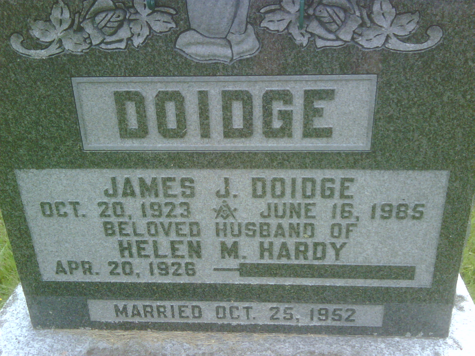 James J. Doidge was born on 20 October 1923 at Ontario; Date Oct 20 1923 per Memorial.1 He died on 16 June 1985 at age 61; Date Jun 16 1985 per Memorial.1 He was buried on 19 June 1985 at Cramahe Hill Cemetery, Cramahe Twp., Morganston, Northumberland Co., Ontario; Memorial: (See Exhibit) DOIDGE; James J. Doidge; Oct. 20, 1923 (Masonic Symbol) June 16, 1985; Beloved Husband of; Helen M. Hardy; Apr. 20, 1926 - -- (Cramahe Hill Cemetery, Cramahe Twp. (Morganston), Jul 15 2009.)1