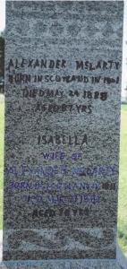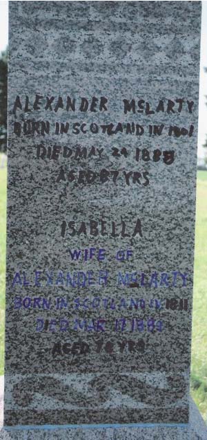Alexander McLarty was born in 1801 at Campbelltown, Argyll, Scotland; Date 1801 & location Scotland per Memorial. Date 1801 & location Scotland per 1861 Census. per marriage register of daughter Catherine (McLarty) Lang. Location Campbelltown, Argyll, Scotland per family tree of Richard Potetz on ancestry.com, April 17 2015.1,2,3,4 He Witness at marriage of Archibald Thompson & Margaret McLarty. on 15 May 1837 at Darlington, Home District, Ontario.1 He married Isabella Thompson on 18 June 1837 at Darlington, Ontario Co., Ontario; Marriage Register: Groom: Alexander McLarty; Bride: Isabella Thompson; Date: Jun 18 1837; Place: Darlington; Wit.: Archibald Thompson & Christopher McRae (Ontario Marriage Registers, 1801 - 1928, Home District, 1837, pg. 35 of 45 ancestry.com) Date Jun 1838 & location Oshawa, Ont. per family tree of Richard Potetz on ancestry.com, April 17 2015. per marriage register of daughter Catherine (McLarty) Lang.1,4 Alexander McLarty appeared on the census of April 1861 at North Dumfries Twp., Waterloo Co., Ontario; Age 60 at 1861 Census: McLarty, Alexander, 60, b. Scotland, CS, farmer, married; Isabel, 58, b. Scotland, CS, married; Donald, 20, b. UC, CS, farmer, single; Margaret, 17; John, 15; Maria, 13; Alexander, 9 (1861 Census: North Dumfries Twp., Waterloo Co., pg. 129 of 929, line 44 - ancestry.com.)3 He died on 24 May 1888 at Neche Twp., Pembina Co., North Dakota, U.S.A; Date May 24 1888 per Memorial. Location North Dakota per email from Jean McLarty Potetz, April 17 2015. Location Neche, Pembina, North Dakota per family tree of Richard Potetz on ancestry.com, April 17 2015.2,5,4 He was buried on 26 May 1888 at North Dakota, U.S.A; Memorial: (see Exhibit) Alexander McLarty; Born in Scotland in 1801; Died May 24, 1888; Aged 87 YRS; Isabella; Wife of; Alexander McLarty; Born in Scotland in 1811; Died Mar 11 1889; Aged 72 YRS (Image of Memorial sent to me via email by Jean McLarty Potetz, April 17 2015.)2,5
