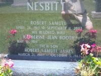 per family tree of godmotheriii on ancestry.ca, Aug 25 2023.1,3,4 As of 7 June 1941,her married name was Nesbitt.1 She married Robert Samuel Nesbitt, son of Edwin James Nesbitt and Nellie Foster Jones, on 7 June 1941 at Cobourg, Northumberland Co., Ontario; Marriage Notice: Groom: Mrs. Robert Samuel Nesbitt; Parents: Edwin James Nesbitt & - ; Bride: Katherine Jean = ; Date: Jun 7 1941; Place: Cobourg (Marriage notice in Newspaper Index, ancestry.ca. per GEDCOM of Ellie Cameron (ecam@home.com) Sep 9 2014.1,5 Katherine Jean Booth lived in 1963 at Brighton, Northumberland Co., Ontario; "176 Nesbitt, Robert R., canner, Brighton" & "177 Nesbitt, Jean - Brighton" & "178 Nesbitt, Catherine, teacher, Brighton" & "179 Nesbitt, Helena, widow, Brighton" Canada Voters Lists, 1963, Northumberland Co., pg. 65 of 203, ancestry.ca.6 She lived in 1972 at 56 Sanford St., Brighton, Northumberland Co., Ontario; "196 Nesbitt, Robert, manufacturer, 56 Sandford St., Brighton" & "197 Nesbitt, Ms. Jean, - 56 Sandford St., Brighton" Canada Voters Lists, 1972, Northumberland Co., Brighton Village, ancestry.ca.6 She lived on 16 August 2004 at 11 Dorman St., Brighton, Northumberland Co., Ontario; Land Registry Records (Transfer 348507) show that Katherinne Jean Nesbitt sold "Part 2 Plan 38R313, last deed 111234", of lot 1, concession 2, Brighton Twp., Northumberland Co. to Murray Lloyd Crapper & Nancy Jane Crapper (Joint Tenants) for $216,000. ITS Date: Aug 16 2004. (Ontario Land Registry Records, Northumberland Co., Brighton Village, Book 015, pg. 194 of 272, page copied from OnLand.ca by Dan Buchanan, Nov 2 2023.)7 She died on 29 November 2009 at Trenton, Hastings Co., Ontario, at age 95; Date Nov 29 2009 & location Trenton per family tree of godmotheriii on ancestry.ca, Aug 25 2023.3 She was buried on 2 December 2009 at Mount Hope Cemetery, Brighton, Northumberland Co., Ontario; Memorial: (see Exhibit) NESBITT; Robert Samuel; April 26, 1913 (Masonic Symbol) September 11, 2003; His Beloved Wife; Katherine Jean Booth; May 10, 1914 - ; Their Son; Robert Samuel James; March 21, 1947 - October 5, 1963 (Mount Hope Cemetery, Brighton, image by Dan Buchanan, Jun 30 2008.)8